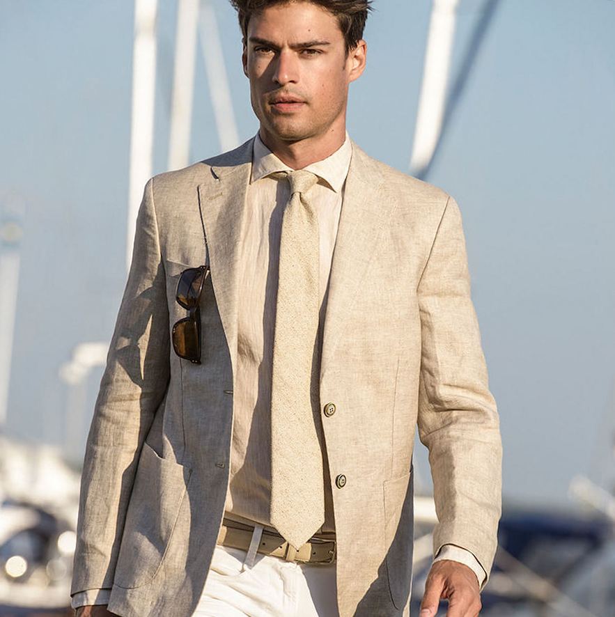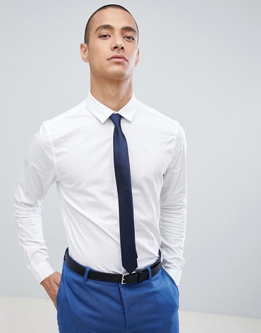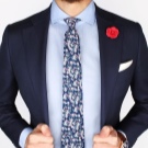 Με φόντο ένα λευκό πουκάμισο και ένα μπλε κοστούμι παντελονιού, 2 επιλογές για γραβάτες θα φαίνονται υπέροχες: