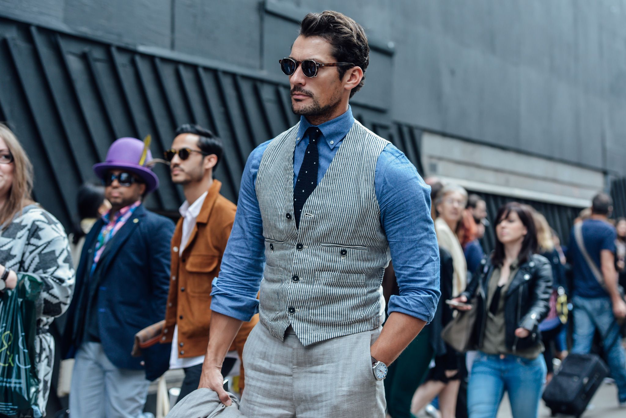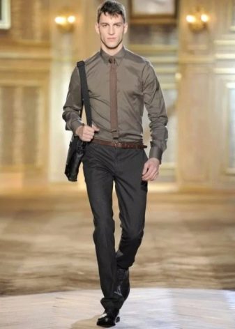Σε ένα παρόμοιο σύνολο, μπορείτε να προσθέσετε μια καφέ δερμάτινη ζώνη και παπούτσια παρόμοιου χρώματος, αλλά σε πιο σκούρο τόνο.
