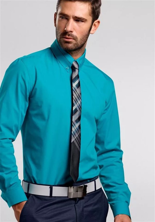 Ένας τολμηρός συνδυασμός θα φανεί ενδιαφέρον μπλε πουκάμισο και παντελόνι σε χακί... Ένα παρόμοιο σύνολο μπορεί να συμπληρωθεί με μια γραβάτα φτιαγμένη σε χρώμα παρόμοιο με το κοστούμι, αλλά διακοσμημένη με μικρές εκτυπώσεις που δεν θα ξεχωρίζουν δραστικά από το συνολικό σύνολο.