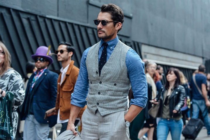 Ένα μπλε κομψό πουκάμισο, που συμπληρώνεται από ένα λευκό γιλέκο με λεπτές και σκούρες ρίγες, θα είναι μια εξαιρετική βάση για σκούρο μπλε (κοντά στο μαύρο) γραβάτα... Το αξεσουάρ μπορεί να είναι όχι μόνο απλό, αλλά και "αραιωμένο" με μικρά λευκά χιονισμένα μπιζέλια.