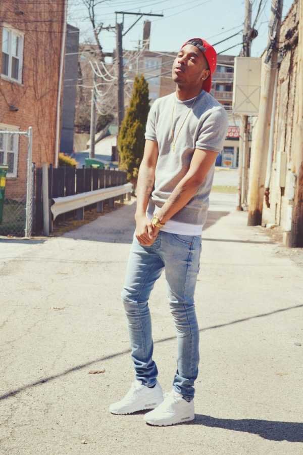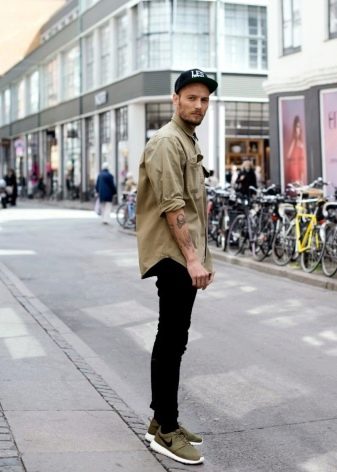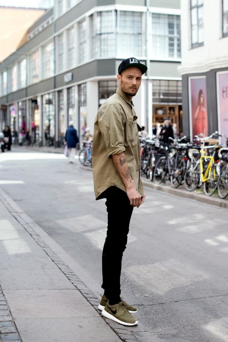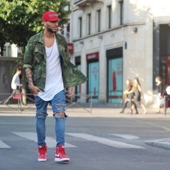 Καθημερινή πρίζα για αληθινά αγοράκια. Το κλασικό μείγμα από σκισμένα μπλε τζιν και ένα λευκό μακρυμάνικο μπλουζάκι συμπληρώνεται με ένα πουκάμισο με μανίκια 3/4 σε στρατιωτική εκτύπωση. Τα τατουάζ με τα χέρια και η αλυσίδα προσθέτουν βιαιότητα στο βλέμμα. Τα αθλητικά παπούτσια Nike Jordan και το κόκκινο καπάκι είναι εντυπωσιακά. Παρά τον συνδυασμό πολλών πρωτότυπων πραγμάτων ταυτόχρονα, η εμφάνιση φαίνεται πολύ αρμονική.