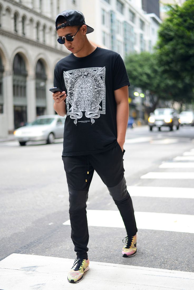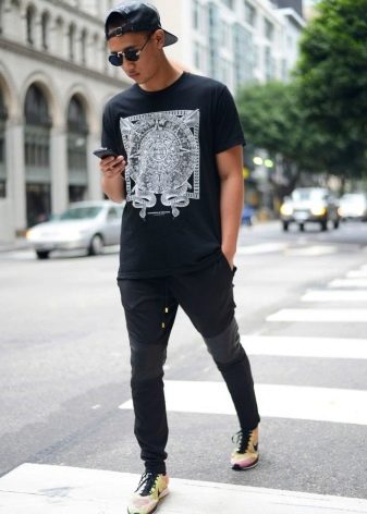 Ένα ημι-αθλητικό ρούχο στο οποίο μπορείτε να κάνετε μια βόλτα στο πάρκο ή να τρέξετε στην πόλη για επαγγελματικούς λόγους. Ένα σκούρο μπλε μπουφάν σε συνδυασμό με παντελόνια από χοντρό ύφασμα του ίδιου χρώματος συμπληρώνεται με ένα λευκό μπλουζάκι με μοτίβο με τη μορφή γυαλιών ηλίου. Τα ασπρόμαυρα πάνινα παπούτσια είναι ένα σύμβολο άνεσης που ταιριάζει με αυτό το ντύσιμο. Ολοκληρώνεται το ντύσιμο με ένα καπέλο μπέιζμπολ της Nike με λευκά γράμματα Harles και μια ευθεία κορυφή.