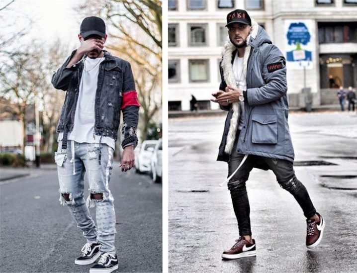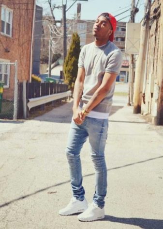 Οι νέοι λατρεύουν να συνδυάζουν ένα headpiece της Nike με τα πάνινα παπούτσια της μάρκας. Αυτό κάνει την εικόνα πιο αρμονική. Σε αυτή την περίπτωση, παρουσιάζεται μια έξοδος στην κρύα εποχή με μονωμένο καπάκι του μπέιζμπολ. Τα σκισμένα μαύρα τζιν με ελαφρύ ξεθώριασμα συμπληρώνονται με ένα λευκό μπλουζάκι. Τα εξωτερικά ενδύματα είναι ένα πάρκο σε χρώμα τζιν με φυσική γούνα αλεπούς από μέσα. Το σακάκι φοριέται ορθάνοιχτα, γεγονός που δίνει στην εικόνα ένα είδος χαλάρωσης. Ολοκληρώνει την εμφάνιση ένα μαύρο καπάκι με μπορντό γράμματα και μπορντό αθλητικά παπούτσια Nike με λευκή σόλα.