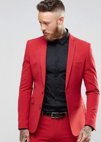 Το κόκκινο κοστούμι φαίνεται κομψό και φωτεινό. Μια ενδιαφέρουσα εμφάνιση δημιουργείται σε βάρος ενός ασυνήθιστου κομμένου σακάκι με μαύρα ένθετα. Και για να μην φαίνεται ζοφερή και ζοφερή, είναι προτιμότερο να επιλέξετε ένα λευκό μπλουζάκι.