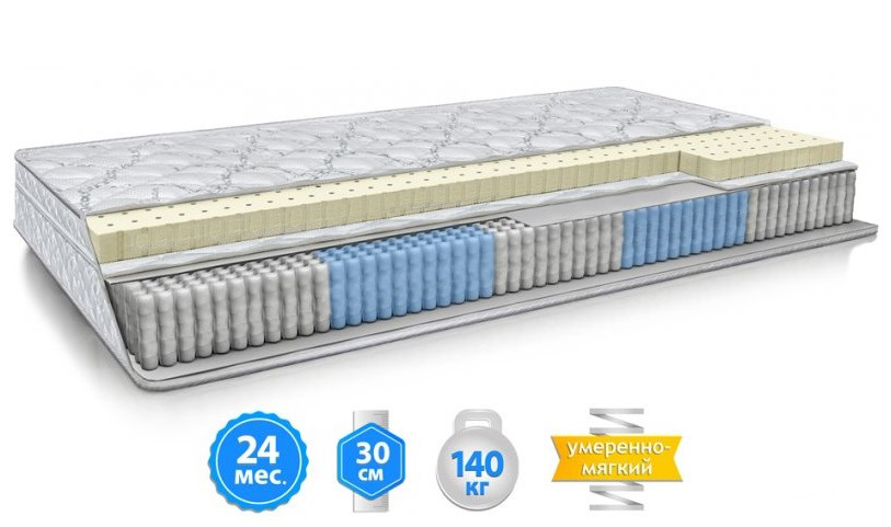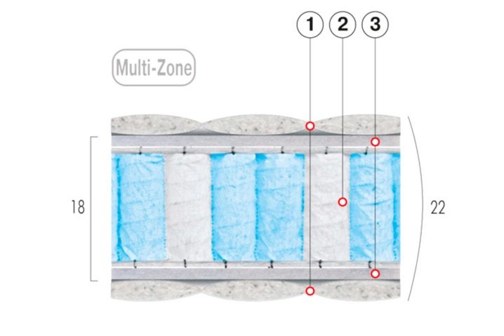 Οι τρεις ζώνες ενισχύονται έτσι ώστε τα βαρύτερα μέρη του σώματος να βάζουν το ίδιο φορτίο στο στρώμα. Κάθε ελατήριο βρίσκεται σε ξεχωριστή θήκη και δεν έρχεται σε επαφή με άλλα μέρη του προϊόντος, λόγω του οποίου επιτυγχάνεται χαμηλό επίπεδο θορύβου κατά την αλλαγή θέσεων. Αυτό το κριτήριο μπορεί να είναι σημαντικό για όσους χρειάζονται ελαφρύ ύπνο και πλήρη σιωπή. Σε κάθε πλευρά υπάρχει μια διπλή ίνα λατέξ καρύδας, η οποία καθιστά το στρώμα πιο ανθεκτικό και ελαστικό, και επίσης αποτρέπει την κατάρρευση μεμονωμένων τμημάτων της επιφάνειας. Αυτή η επίστρωση δεν είναι ευαίσθητη σε μούχλα, δεν απορροφά οσμές, λόγω των οποίων δεν επιδεινώνεται κατά τη λειτουργία της.