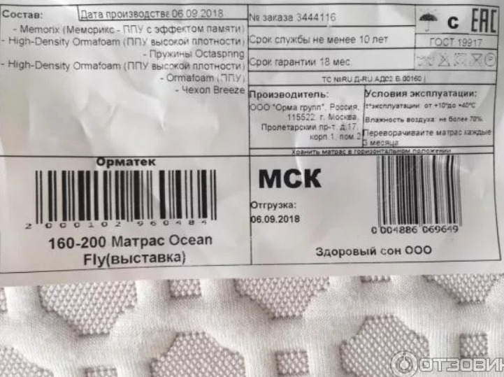 Το ύφασμα που αποτελεί την επένδυση του στρώματος και το "στρώμα" δεν πρέπει να έχει ελαττώματα: ίνες που σέρνονται και μπερδεύονται, στραβή ή ελαττωματική ραφή. Η ετικέτα υποδεικνύει: