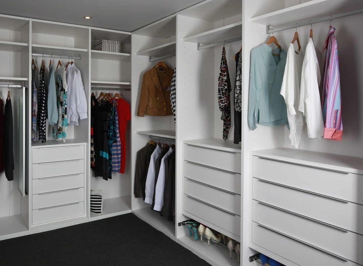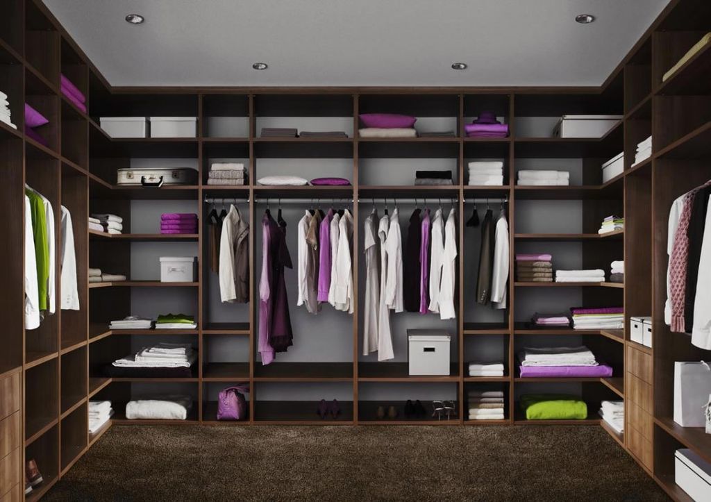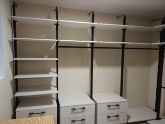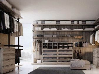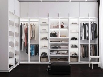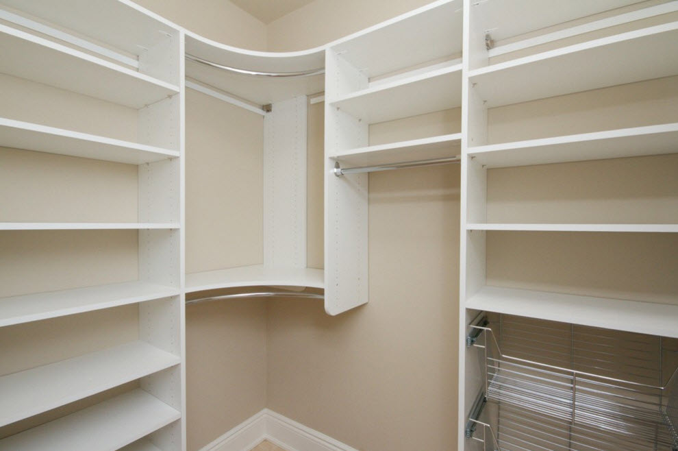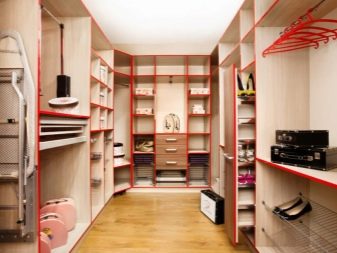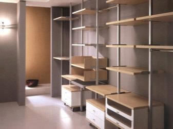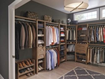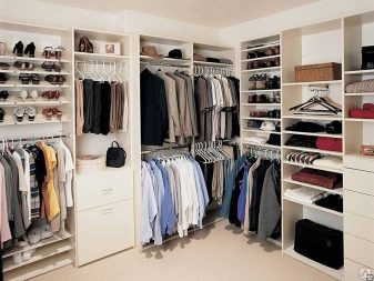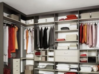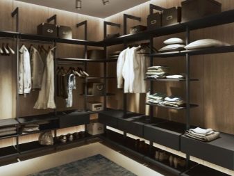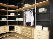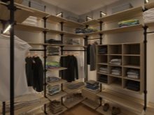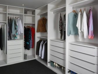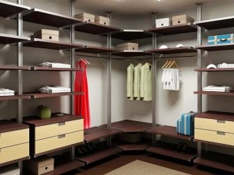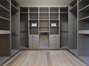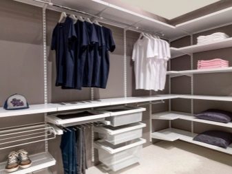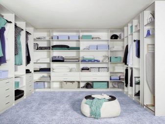 Η ουσία τους είναι στην πραγματικότητα η ίδια: τα συστήματα αποθήκευσης τοποθετούνται κατά μήκος των τοίχων από τη γωνία και στη μέση υπάρχει χώρος για την αλλαγή ρούχων. Στο καμαρίνι μιας εντυπωσιακής περιοχής, υπάρχει μια θέση για μια διάταξη ραφιών σε σχήμα U. Αυτή είναι μια δημοφιλής λύση όταν πρόκειται για την εγκατάσταση μιας προκατασκευασμένης μεταλλικής κατασκευής. Αυτή η επιλογή θα φανεί εξαιρετική εάν το συνολικό πλάτος του τοίχου είναι από 2 έως 3 μέτρα.