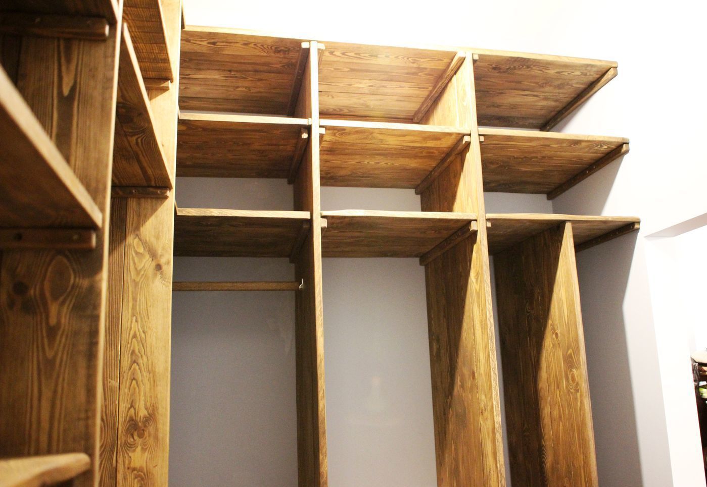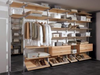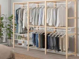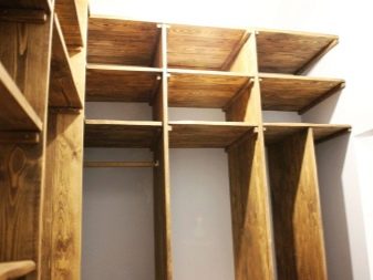 Συχνά, ξύλινα ράφια χρησιμοποιούνται για τον εξοπλισμό των χώρων γκαρνταρόμπας. Αυτοί οι τύποι δομών μπορεί να έχουν εντελώς διαφορετικό εξωτερικό σχεδιασμό. Αυτά τα συστήματα χαρακτηρίζονται από ένα εντυπωσιακό επίπεδο χωρητικότητας αποθήκευσης. Αλλά πρέπει να ληφθεί υπόψη ότι τα ξύλινα ράφια είναι αρκετά μαζικά και βαριά. Είναι καλύτερο να τα εγκαταστήσετε σε δωμάτια μιας μεγάλης πλατείας, που περιβάλλονται από ένα κλασικό εσωτερικό στυλ.