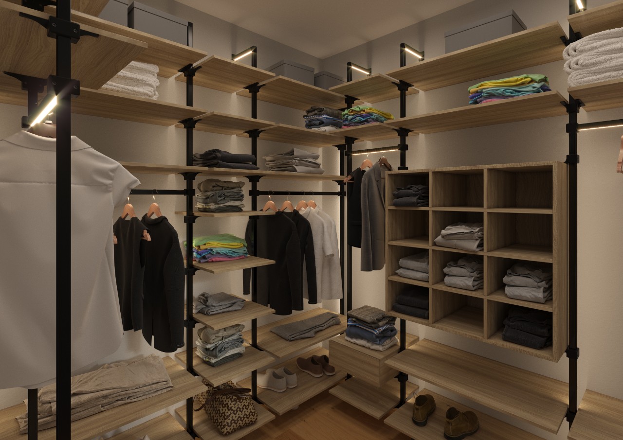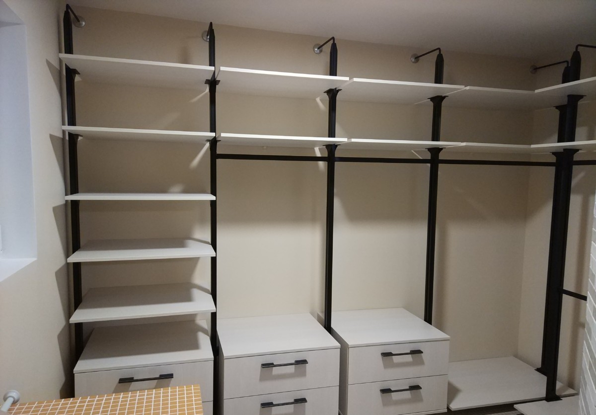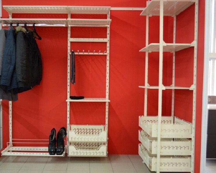 Ενσωματωμένο Αυτές οι δομές πρέπει να στερεώνονται σε τοίχους στο χώρο, καθώς και στο πάτωμα και στην οροφή. Ο πίσω τοίχος σε αυτές τις παραλλαγές ενδέχεται να μην χρησιμοποιείται καθόλου. Τα εξωτερικά ενσωματωμένα συστήματα ραφιών παρουσιάζονται με τη μορφή πλαισίου στήριξης, συναρμολογημένων από υψηλής ποιότητας διάτρητα προφίλ. Σε αυτή τη βάση κρέμονται ράφια για ρούχα, καθώς και ειδικά δίχτυα για παπούτσια.