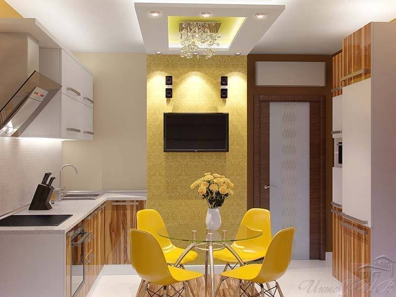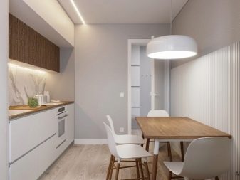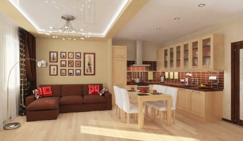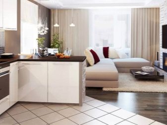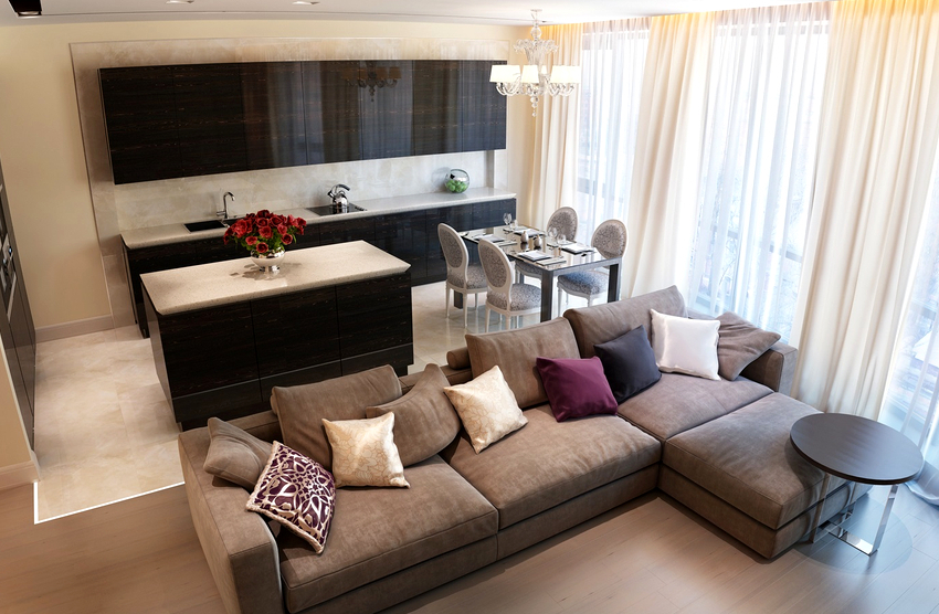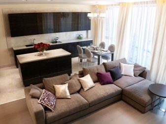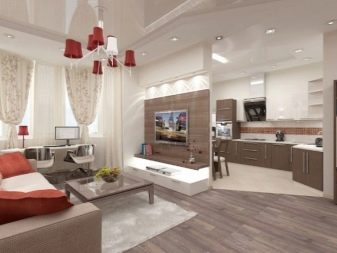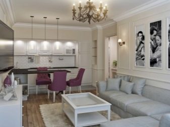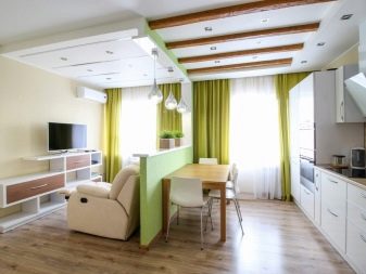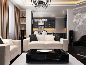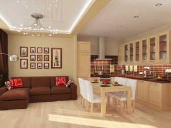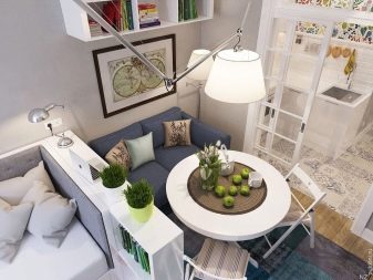 - Σε ορισμένες περιπτώσεις, στο μέγιστο χώρο, οι άνθρωποι τοποθετούν ένα σετ κουζίνας με ένα τραπέζι και δίπλα του εξοπλίζουν ένα σαλόνι. Το κρεβάτι τοποθετείται σε ένα μικρό υπνοδωμάτιο.