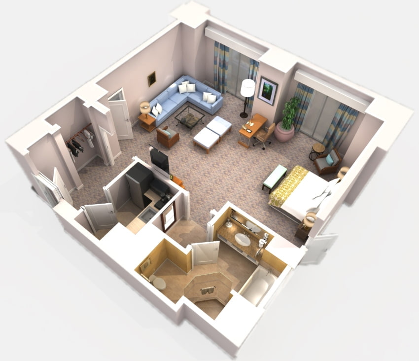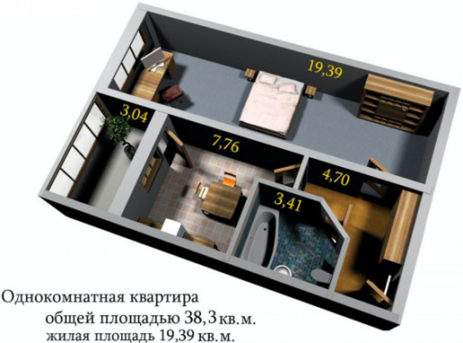 - Με πλάνο 38 τετραγωνικών μέτρων, τις περισσότερες φορές υπάρχει μια πολύ μικρή κουζίνα, καθώς και ένα ευρύχωρο υπνοδωμάτιο.