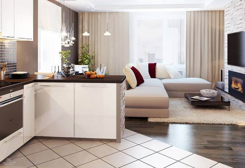 - Ο διαχωρισμός των λειτουργικών περιοχών μπορεί να πραγματοποιηθεί μέσω διαφορετικών υλικών φινιρίσματος. Για παράδειγμα, στο σαλόνι της επικράτειας μπορείτε να στρώσετε ένα χαλί και στην κουζίνα μπορείτε να βάλετε πλακάκια. Με αυτόν τον τρόπο, διαφορετικά καλύμματα δαπέδου θα σηματοδοτούν διαφορετικές περιοχές.
