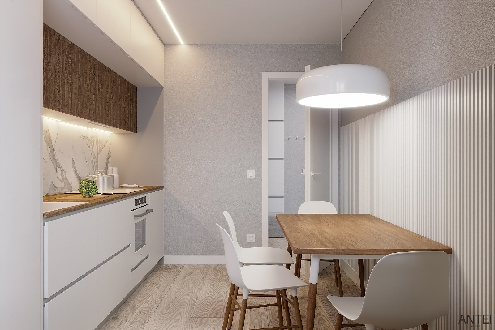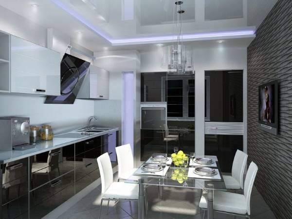 - Για τη διάταξη της κουζίνας, συνιστάται η επιλογή ενσωματωμένων οικιακών συσκευών. Ούτε πρέπει να είναι πολύ μεγάλο.