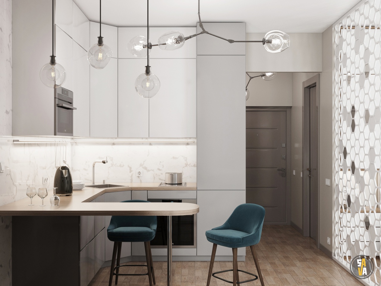 - Χωρίστε την κουζίνα και το μέρος για χαλάρωση σε δύο ξεχωριστές ζώνες θα βγει μέσα από έναν γωνιακό καναπέ ή έναν όμορφο πάγκο μπαρ.