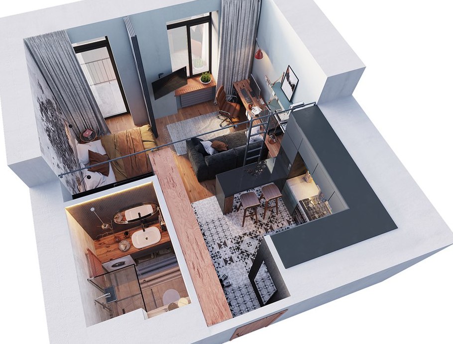 Σχεδιασμός διαμερισμάτων ενός δωματίου με επιφάνεια 38 τ. Μ