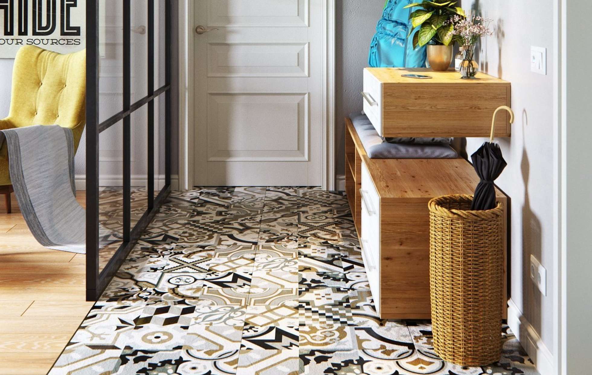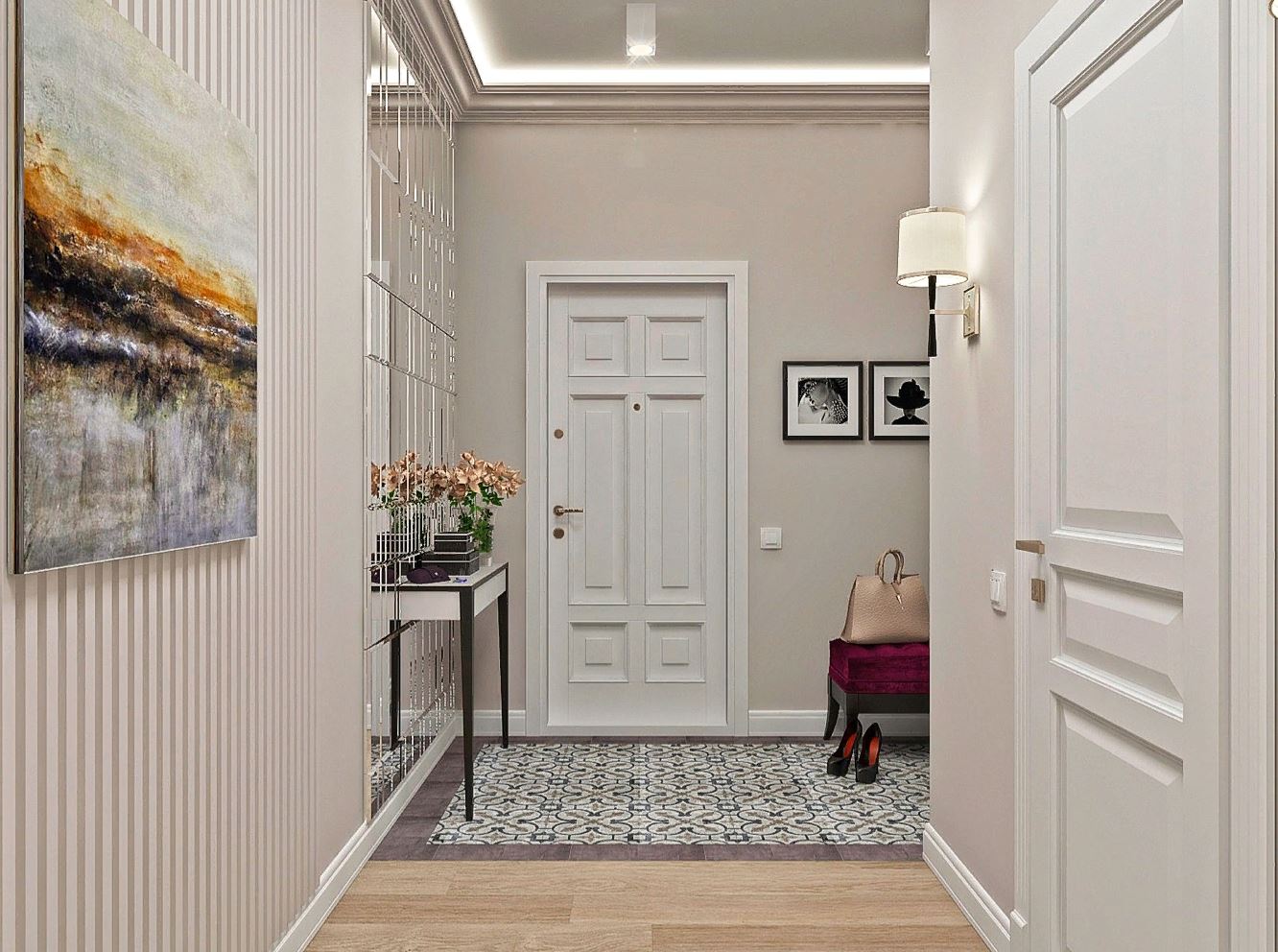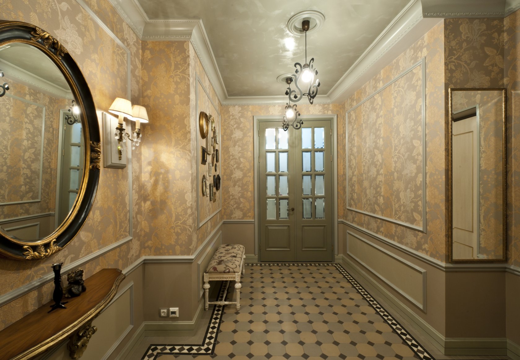 Για παράδειγμα, ο πίνακας στο κεντρικό τμήμα του δαπέδου φαίνεται πολύ πρωτότυπος, κατά μήκος των άκρων του υπάρχει μια διάταξη ψηφιδωτού. Το μοτίβο στο πάτωμα δεν πρέπει να είναι ασυμβίβαστο με το μοτίβο ή τα στερεά χρώματα στον τοίχο. Διαφορετικά, η συνολική εντύπωση της εικόνας που θα δείτε θα χαλάσει εντελώς. Έτσι, στο στυλ των κλασικών, χρησιμοποιούνται μαρμάρινα κεραμίδια. Εάν ο διάδρομος είναι διακοσμημένος προς ανατολική κατεύθυνση, τότε τα μοτίβα μπορεί να συνοδεύονται από μπούκλες που θυμίζουν ιερογλυφικά ή αραβικά γράμματα, εβραϊκά.