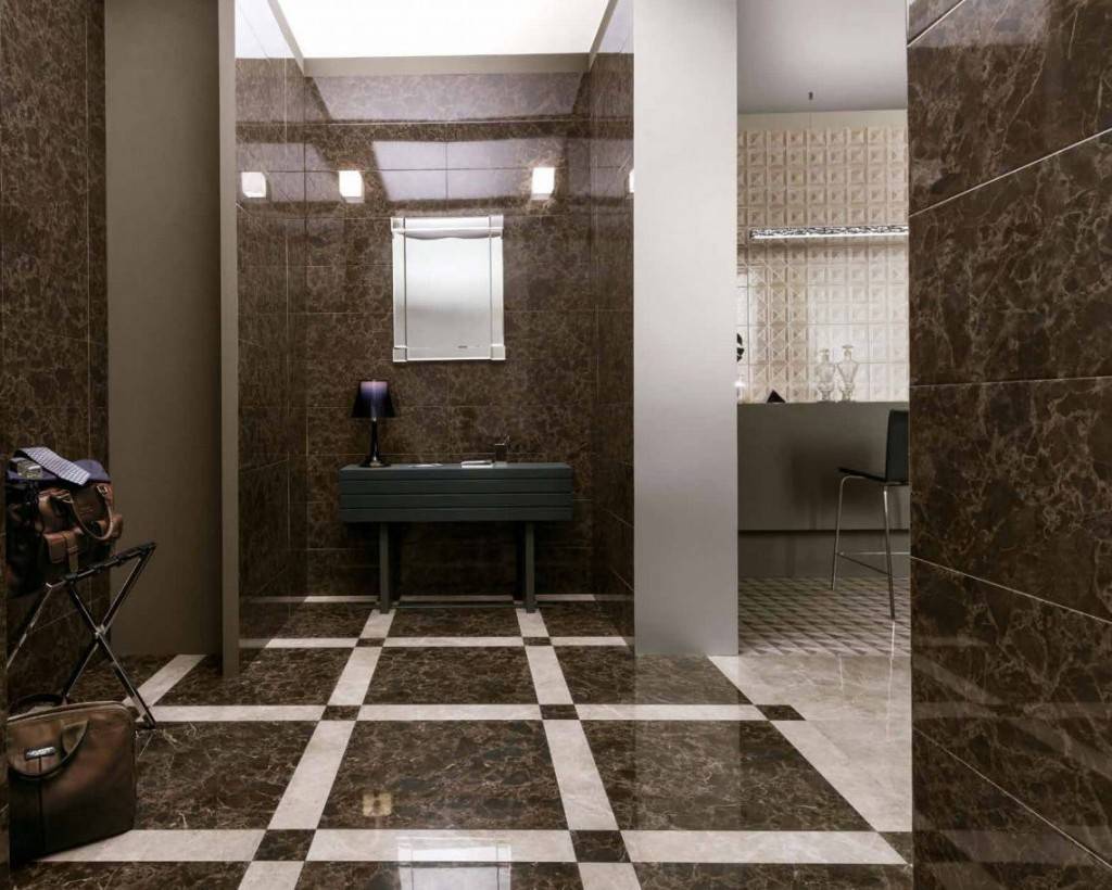 - Γυαλιστερό (καθρέφτης)... Η αντανάκλαση όλων των λεπτομερειών σε αυτό θα είναι η καλύτερη. Μόνο ένας πραγματικός καθρέφτης θα είναι μια άξια επιλογή. Σε μια μικρή περιοχή του διαδρόμου (έως και αρκετά τετραγωνικά μέτρα), δεν συνιστάται η χρήση γυαλιστερής υφής. Η παραμικρή ρωγμή θα τραβήξει αμέσως το βλέμμα ενός ατόμου που βλέπει αυτήν την επίστρωση.