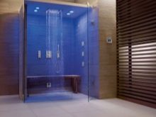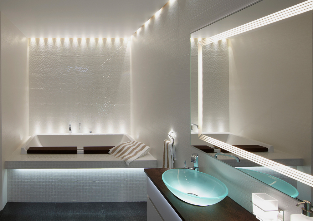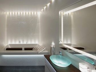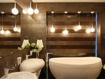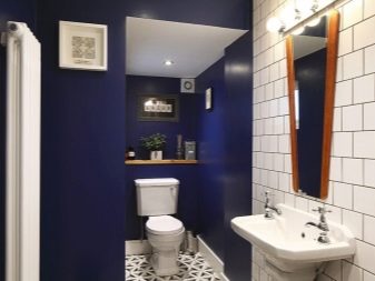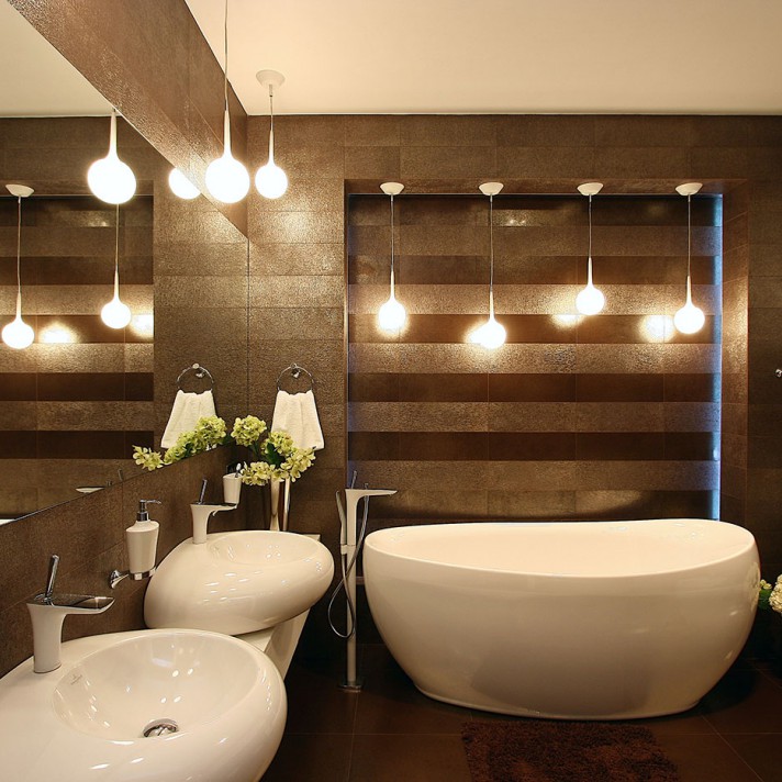 Αυτή η λύση φαίνεται απλώς ξεπερασμένη - στην πραγματικότητα, αυτοί οι τόνοι είναι πιο δικαιολογημένοι στο μπάνιο και την τουαλέτα καθαρά ψυχολογικά, δηλαδή δύσκολα μπορούν να ξεπεραστούν. Αλλά οι λαμπερές και πολύ επιθετικές αποχρώσεις πρέπει να αποφεύγονται, επειδή το συναισθηματικό σοκ δεν χρειάζεται σχεδόν εκεί. Σε κάθε μέρος του μπάνιου, τοποθετούνται ένα ή δύο σημεία φωτισμού.Η επιλογή των επιλογών τους είναι απεριόριστη, το μόνο πράγμα είναι ότι ένας κομψός πολυέλαιος σε ένα τέτοιο δωμάτιο θα φανεί ειλικρινά γελοίο.