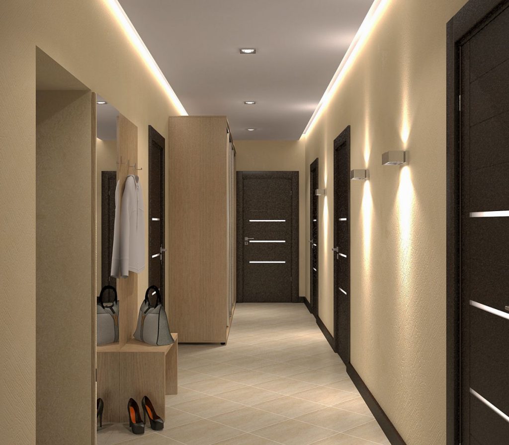 Το να στερήσουμε την προσοχή του χώρου του διαδρόμου είναι ελάχιστα λογικό. Τουλάχιστον, πρέπει να υπάρχει κρεμάστρα και ράφι (βιβλιοθήκη) για παπούτσια. Είναι όμως χρήσιμο να εξοπλίσουμε τόσο ένα καθιστικό (για να είναι πιο άνετο το ντύσιμο και το γδύσιμο), όσο και μια κάθετη επιφάνεια έτσι ώστε οι τσάντες, τα πακέτα κ.λπ. να μην χρειάζεται να πετιούνται στο πάτωμα. Δεδομένου ότι ο χώρος του διαδρόμου σε ένα διαμέρισμα πέντε δωματίων είναι αρκετά μεγάλος, είναι ακόμη δυνατό να τοποθετήσετε μια πλήρη ντουλάπα.