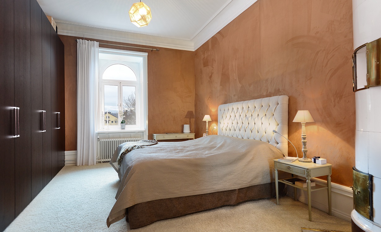 Έτσι μοιάζει ένα από τα υπνοδωμάτια σε ένα διαμέρισμα πέντε δωματίων. Η εντυπωσιακή αντίθεση μεταξύ πρόσοψης τοίχου και επίπλων, τοίχου και δαπέδου είναι πολύ ευχάριστη και σωστή. Είναι αμέσως προφανές ότι οι σχεδιαστές έχουν επιλέξει επιδέξια τα υλικά φινιρίσματος. Ο φωτισμός επίσης δεν είναι ικανοποιητικός. Η τοξωτή ολοκλήρωση του παραθύρου είναι μια κομψή και μη τυπική κίνηση μέχρι στιγμής.