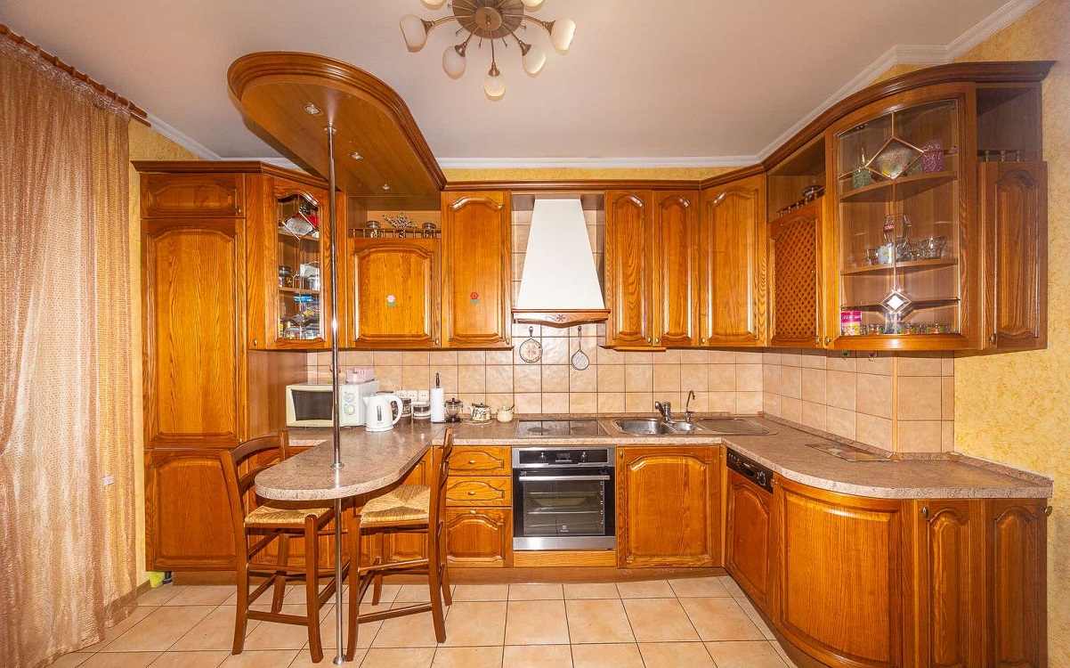Και έτσι φαίνεται μια κουζίνα με προσόψεις από φυσικό ξύλο. Ένας ντεμοντέ πολυέλαιος τονίζει μόνο αυτό το αποτέλεσμα. Το δάπεδο με πλακάκια ενός διακριτικού χρώματος είναι αρμονικό. Ταιριάζει με την ίδια ποδιά.