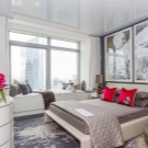 Εάν το δωμάτιο δεν μπορεί να καυχηθεί για μεγάλες διαστάσεις, τότε μπορείτε να προτιμήσετε τις γυαλιστερές επιλογές, οι οποίες, με μια ικανή προσέγγιση, μπορούν να αυξήσουν τον οπτικό χώρο. Πρέπει να ληφθεί υπόψη ότι όσο πιο ελαφρύς είναι ο ίδιος ο καμβάς, τόσο περισσότερος χώρος και ελαφρότητα θα υπάρχει στο δωμάτιο.