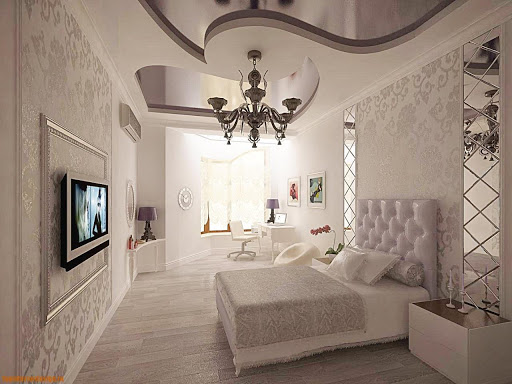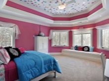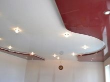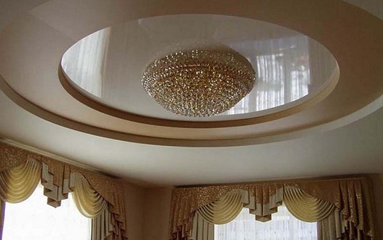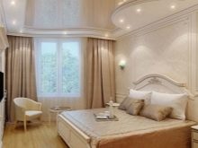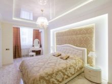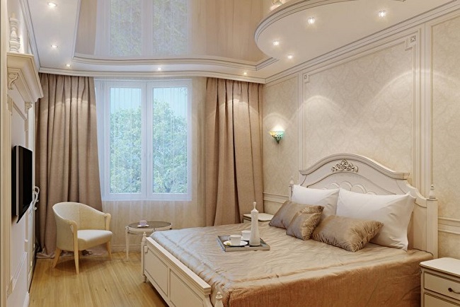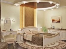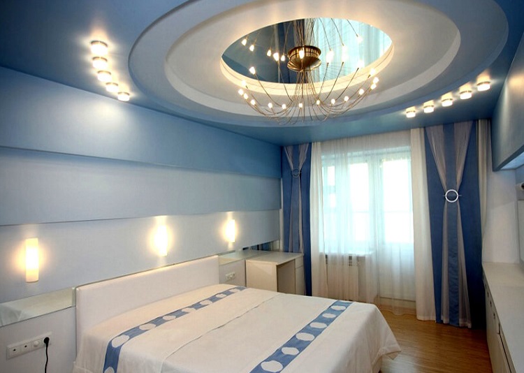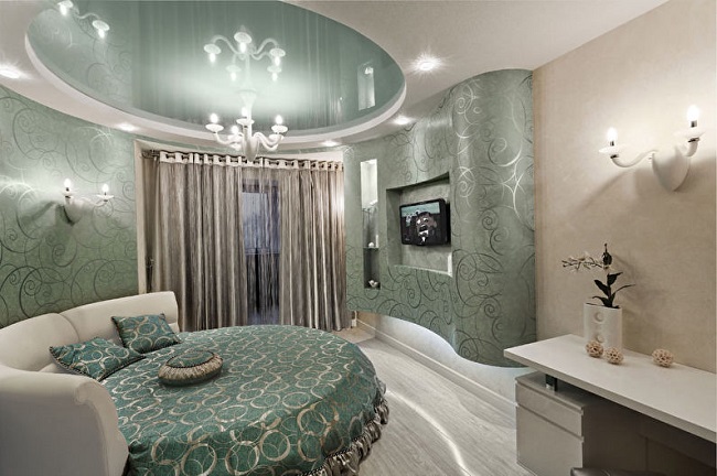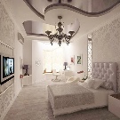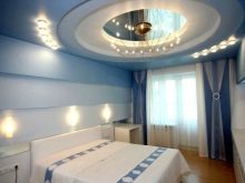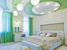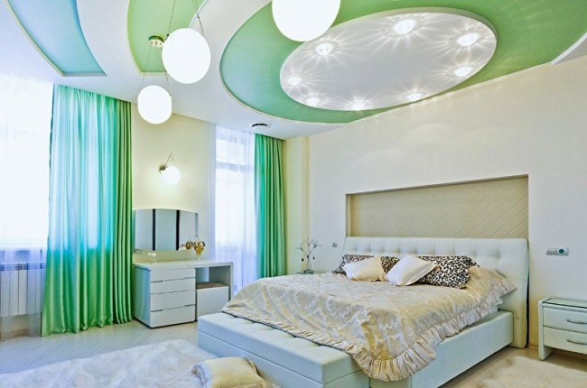 Οι πολυεπίπεδες κατασκευές είναι κατάλληλες μόνο για μεγάλα υπνοδωμάτια, καθώς καταλαμβάνουν πολύ χώρο και θα φαίνονται ακατάλληλα σε ένα μικρό υπνοδωμάτιο Χρουστσόφ. Εάν το συνηθισμένο λευκό χρώμα φαίνεται πολύ βαρετό, τότε μπορεί να αραιωθεί με μπλε ή σμαραγδένιες αποχρώσεις. Επιπλέον, οι τεχνικές σχεδιασμού επιτρέπουν τη χρήση ελκυστικών στολιδιών ή καλουπιών που φαίνονται εξαιρετικά ενδιαφέροντα.