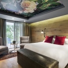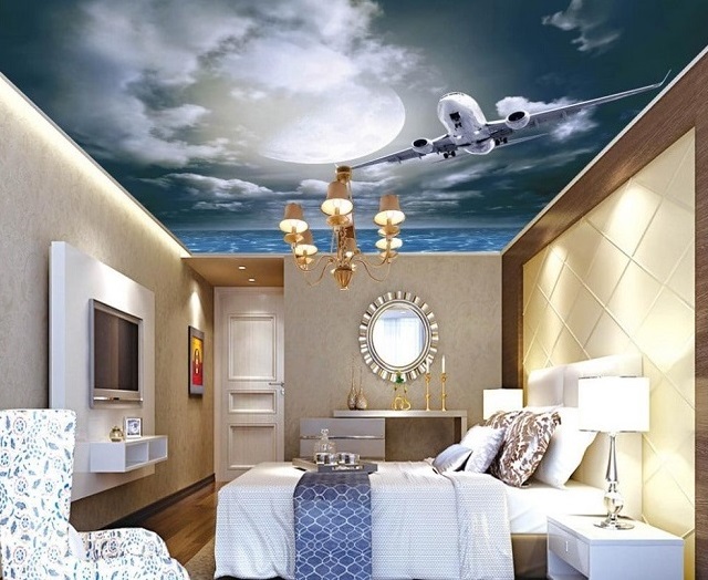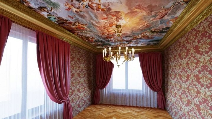 Για παράδειγμα, λευκά και μαύρα χρώματα χρησιμοποιούνται για τη δημιουργία οροφής σε στυλ γιν και γιανγκ. Επιπλέον, μπορείτε να δημιουργήσετε κομψές οροφές στο στυλ του έναστρου ουρανού ή κλασικές κόκκινες επιλογές που θα τονίσουν την πλούσια εμφάνιση του δωματίου.