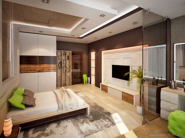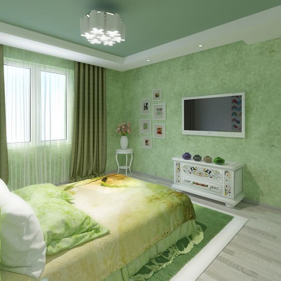 - Μια πράσινη οροφή που ταιριάζει καλά με μπεζ ή γκρι τοίχους. Επιπλέον, σε ένα τέτοιο δωμάτιο θα είναι δυνατή η χρήση αντικειμένων με φυσικές αποχρώσεις. Έρευνες δείχνουν ότι το πράσινο χρώμα σε ένα δωμάτιο είναι ηρεμιστικό και ευνοεί τον καλό ύπνο.