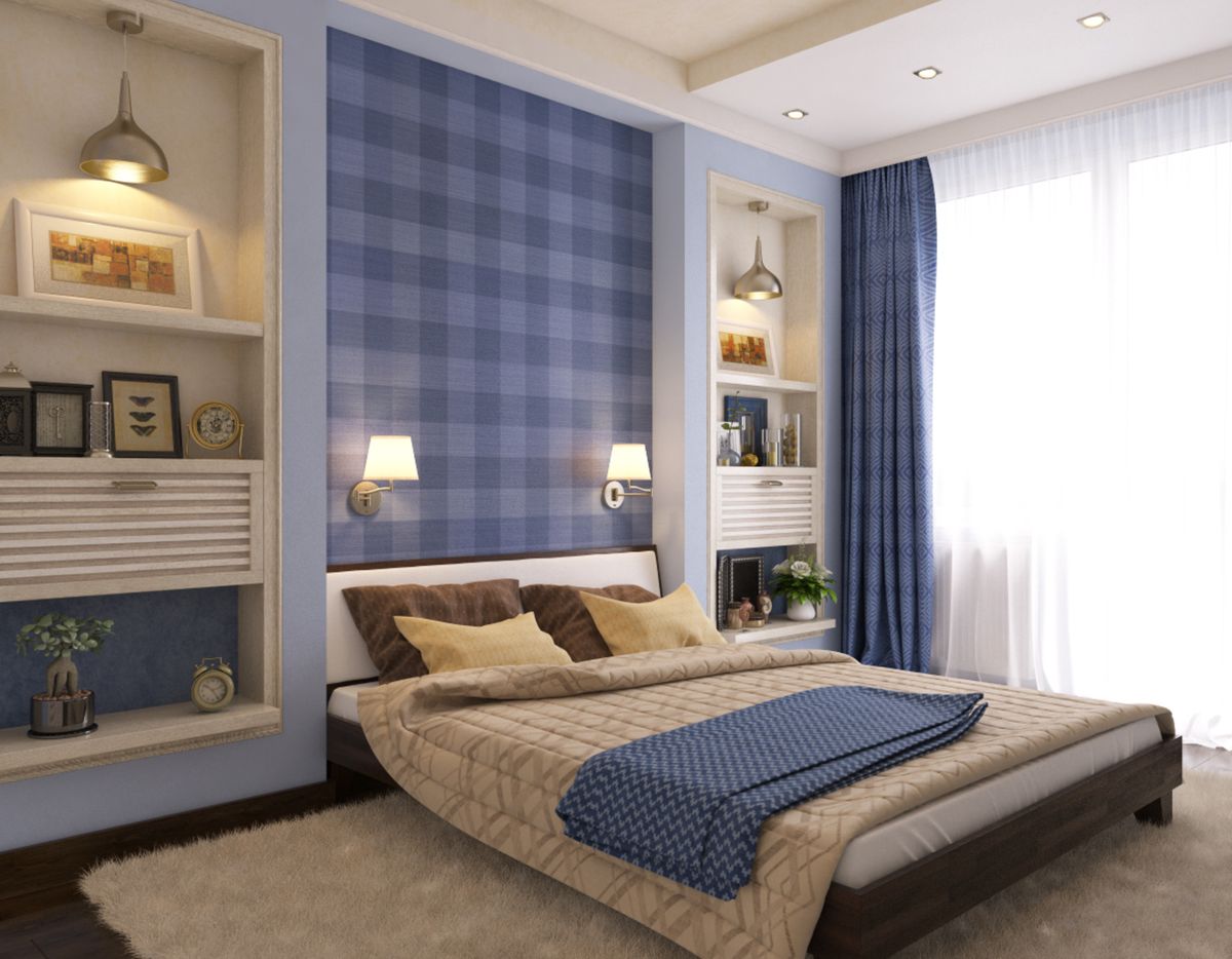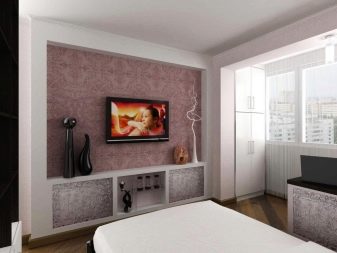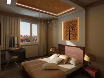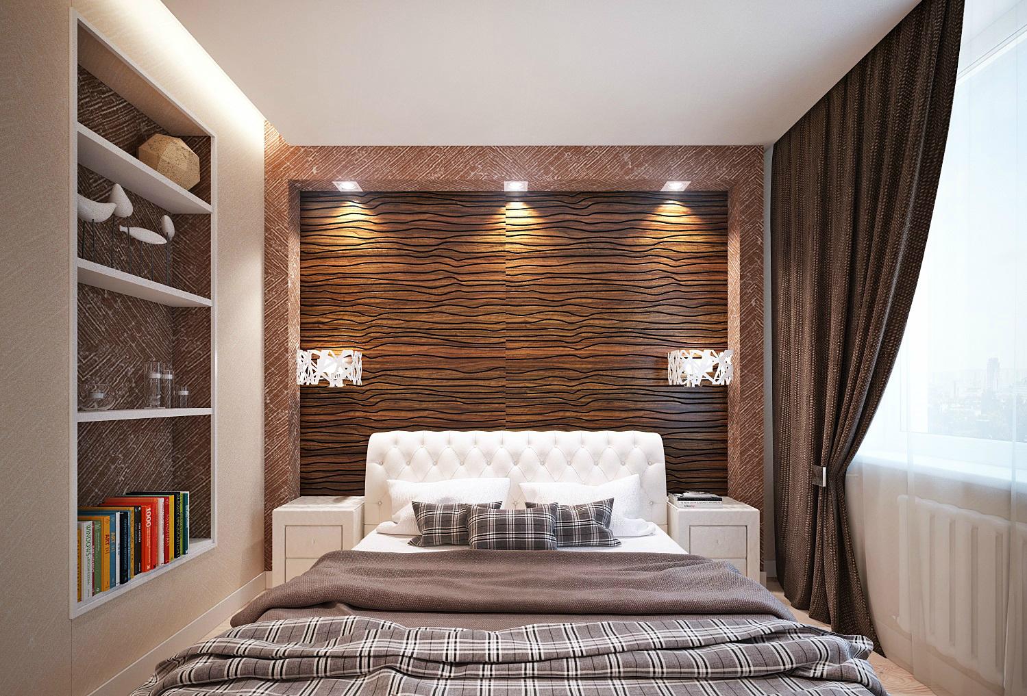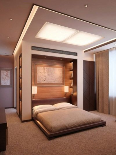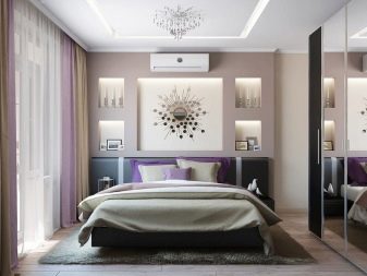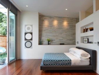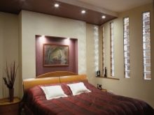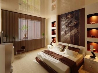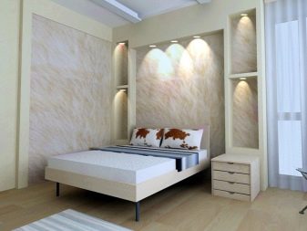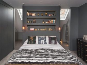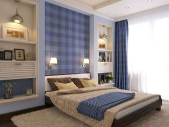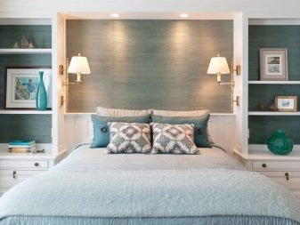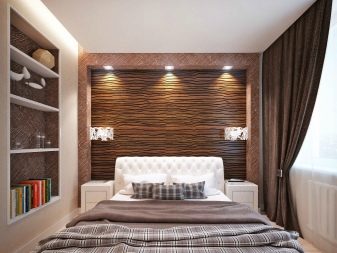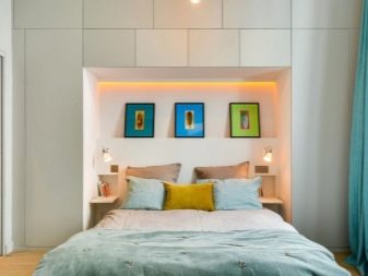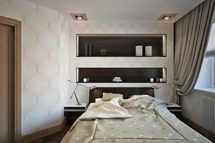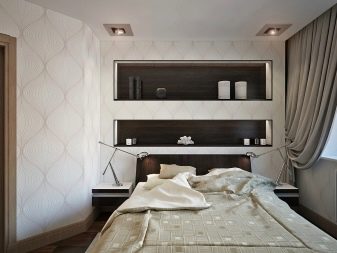Το εσωτερικό της κρεβατοκάμαρας συχνότερα περιλαμβάνει την τοποθέτηση ενός κρεβατιού εκεί. Επομένως, ο σχεδιασμός θα είναι κατάλληλος. Επιπλέον, τα κομοδίνα θα είναι κατάλληλα. Μπορείτε να τοποθετήσετε μια διακριτική διακόσμηση πάνω από το κεφαλάρι με τη μορφή εικόνας ή φωτογραφιών. Εάν το επιθυμείτε, μπορείτε να εξοπλίσετε μικρά ράφια με βιβλία ή άλλα πράγματα εκεί.