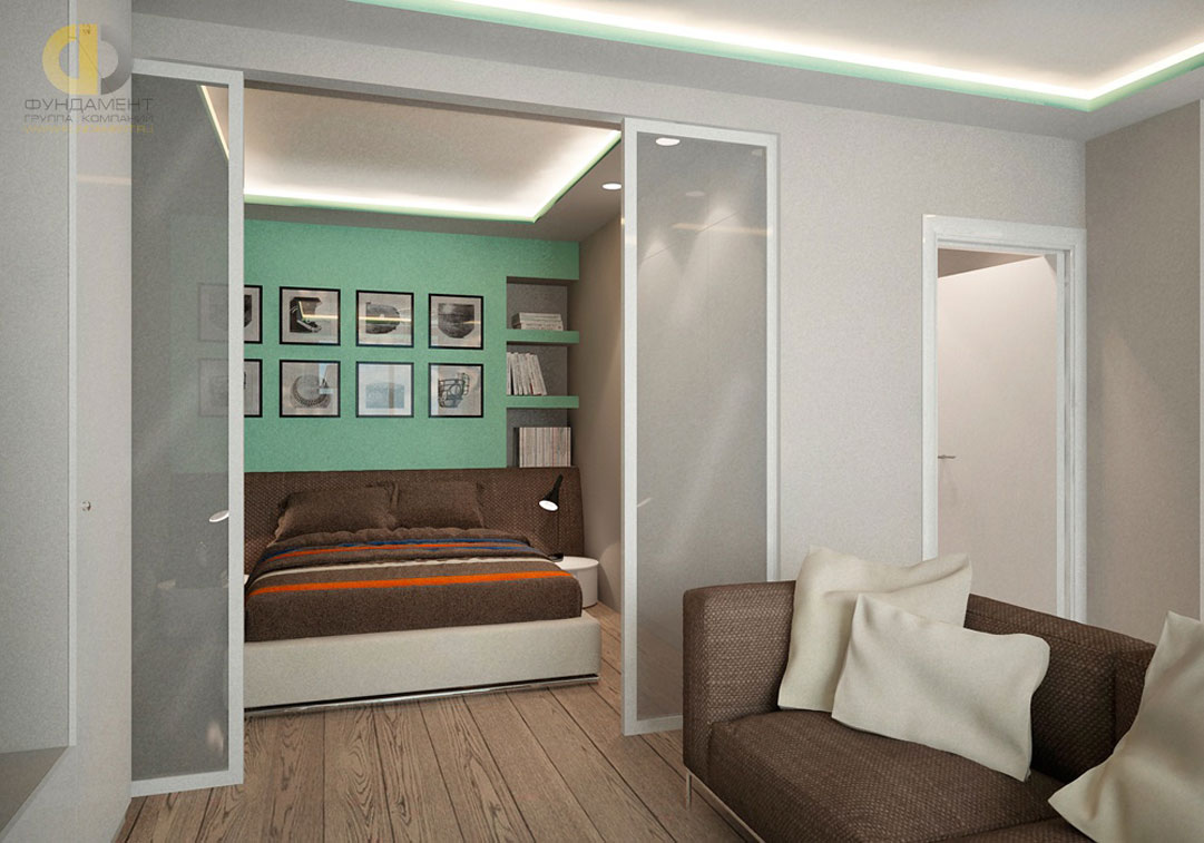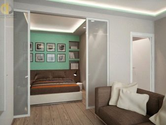 - Εάν χρειάζεστε ξεχωριστό χώρο ύπνου, τότε θα είναι μια βαθιά και ογκώδης θέση για το κρεβάτι. Θα είναι ανοιχτό ή κλειστό, αποφασίζεται με βάση το ύφος και τις ανάγκες των ιδιοκτητών διαμερισμάτων.