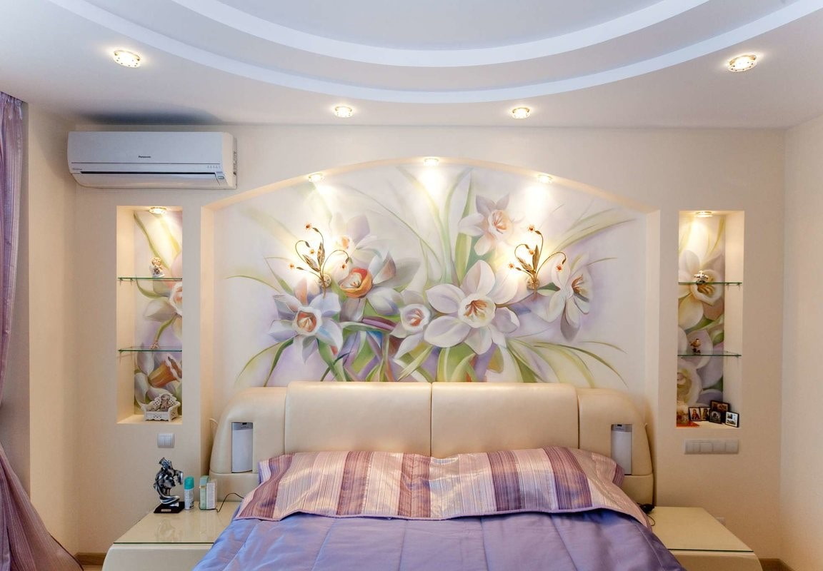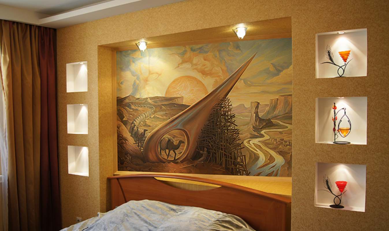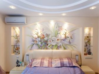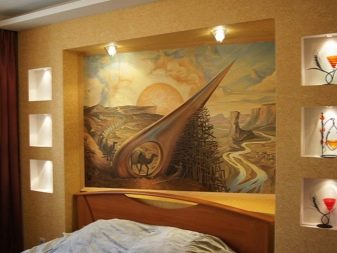 - Μια ενδιαφέρουσα επιλογή όταν υπάρχουν αρκετές κόγχες πάνω από το κρεβάτι. Αυτό σας επιτρέπει να τοποθετήσετε οποιαδήποτε σύνθεση σε μια μεγάλη και να τοποθετήσετε φυτά σε μικρές. Επιπλέον, όλα αυτά συμπληρώνονται αρμονικά με καλά επιλεγμένο φωτισμό. Το κύριο πράγμα σε μια τέτοια κατάσταση είναι ότι ολόκληρος ο σχεδιασμός έχει σχεδιαστεί σε ένα ενιαίο συνδυασμό χρωμάτων, όπως φαίνεται στη φωτογραφία.