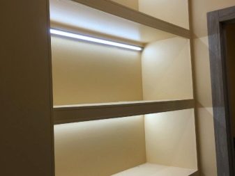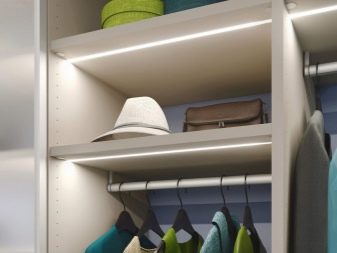 Όταν ένα καμαρίνι βρίσκεται σε μια θέση, αξίζει να προσεγγίσετε την πηγή φωτός από τη θέση ότι θα πρέπει να είναι βολικό να πλοηγηθείτε σε πράγματα στο γκαρνταρόμπα. Επομένως, θα χρειαστεί ο φωτισμός στα ράφια στα ντουλάπια. Και δεν μπορεί κανείς να κάνει χωρίς εναέριο φωτισμό, γιατί σε αυτό το δωμάτιο θα είναι δυνατό να πραγματοποιηθούν εξαρτήματα.