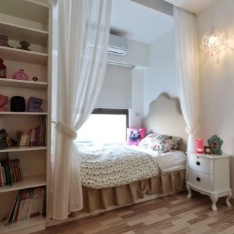 - Οι επιλογές όταν ένα κρεβάτι τοποθετείται σε μια θέση είναι δημοφιλείς. Σε αυτή την περίπτωση, ο χώρος ύπνου δεν ξεχωρίζει με στυλ από τον γενικό χώρο. Οι κουρτίνες που κρύβουν το κρεβάτι φαίνονται αρμονικές στο δωμάτιο.