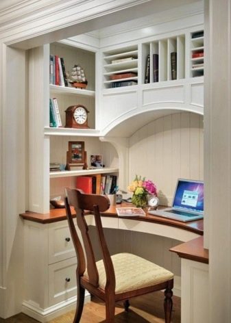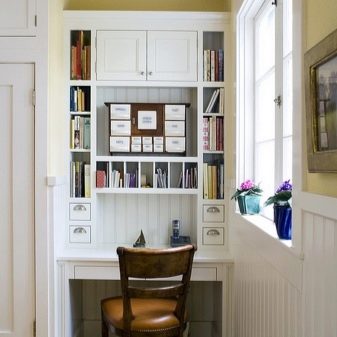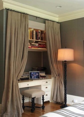 Μια μελέτη που οργανώνεται σε έναν τέτοιο χώρο απαιτεί λειτουργικά έπιπλα, τα οποία θα είναι ένα τραπέζι, ράφια, πιθανώς ένα χρηματοκιβώτιο, μια άνετη καρέκλα. Είναι καλύτερα να απομονώσετε το γραφείο από τον χώρο ύπνου χρησιμοποιώντας ένα συρόμενο σύστημα ή τουλάχιστον μια οθόνη.