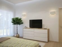 Μία από τις καλύτερες λύσεις είναι να χρησιμοποιήσετε συρταριέρα αντί για μια τυπική βάση τηλεόρασης. Σε αυτή την περίπτωση, θα είναι δυνατό να εγκαταλείψουμε την ανάγκη εγκατάστασης περιττών αντικειμένων στο υπνοδωμάτιο, κάτι που είναι ιδιαίτερα σημαντικό για μικρά δωμάτια. Η τηλεόραση δεν μπορεί μόνο να σταθεί στο κομμό, αλλά και να κρεμαστεί στον τοίχο ακριβώς πάνω από αυτήν.