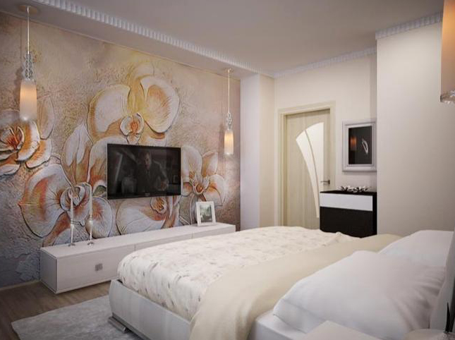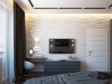 Κατά τον σχεδιασμό του σχεδιασμού και της διακόσμησης της περιοχής τηλεόρασης στο υπνοδωμάτιο, μπορεί να χρησιμοποιηθεί σχεδόν οποιοδήποτε υλικό, ειδικά αν υπάρχει λευκός τοίχος.