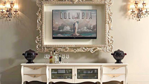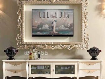 Ένας άλλος αρκετά βολικός τρόπος για να διακοσμήσετε την περιοχή με τηλεόραση είναι ένας συνδυασμός τεχνολογίας με εικόνες. Για να το κάνετε αυτό, μπορείτε να χρησιμοποιήσετε σχεδόν οποιαδήποτε φωτογραφία ή αναπαραγωγές που θα φαίνονται τέλεια δίπλα στην οθόνη. Εάν το εσωτερικό είναι διακοσμημένο σε κλασικό στιλ, τότε η ίδια η τηλεόραση μπορεί να κρυφτεί σε μεγάλα πλαίσια, τα οποία θα φαίνονται αρκετά ενδιαφέροντα και κομψά.