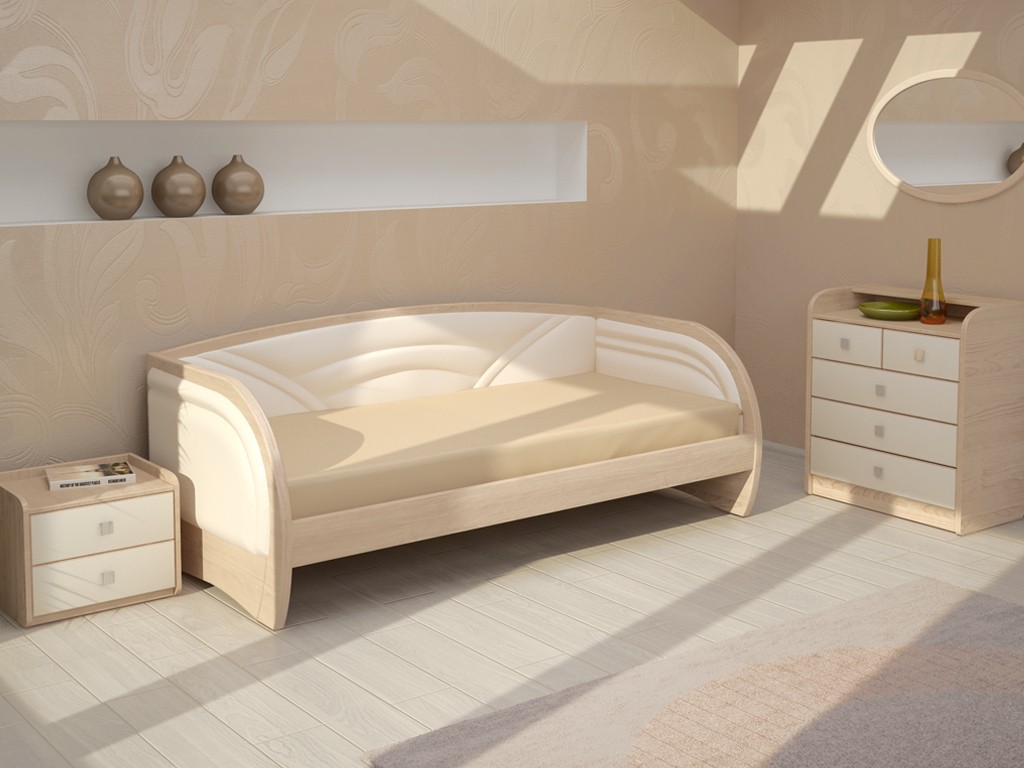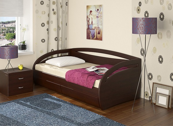 - Κρεβάτι από τη συλλογή Yuma Rumo. Γωνιακό μοντέλο από ξύλο, που μοιάζει με καναπέ, αλλά έχει ένα τεράστιο πλεονέκτημα του κρεβατιού - την παρουσία ορθοπεδικής βάσης και τη δυνατότητα επιλογής του. Διαθέτει λινό κουτί, η πρόσβαση στο οποίο ανοίγει με μηχανισμό ανύψωσης. Το κάτω μέρος του συρταριού είναι αφαιρούμενο, καθιστώντας εύκολο και ευχάριστο τον καθαρισμό των δαπέδων κάτω από το κρεβάτι. Είναι δυνατό να επιλέξετε το υλικό καπλαμά με το οποίο καλύπτεται το προϊόν - καρυδιά, ντεκό, οξιά, βελανιδιά. Επιπλέον, μπορείτε να επιλέξετε τον τύπο υλικού που θα διακοσμήσει το μαλακό μέρος της πλάτης - φυσικό ή τεχνητό δέρμα, ύφασμα ταπετσαρίας.
