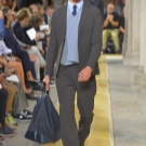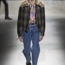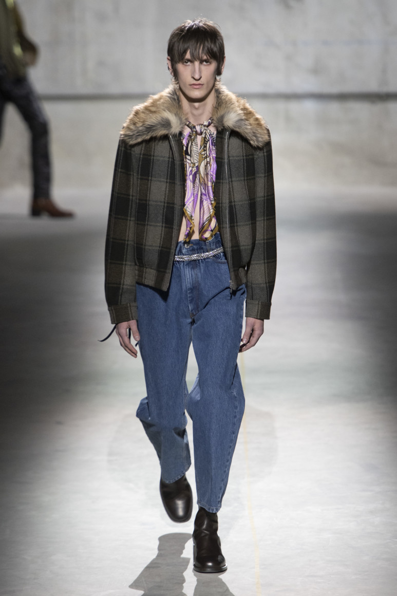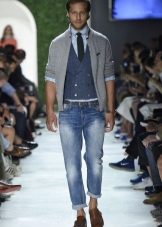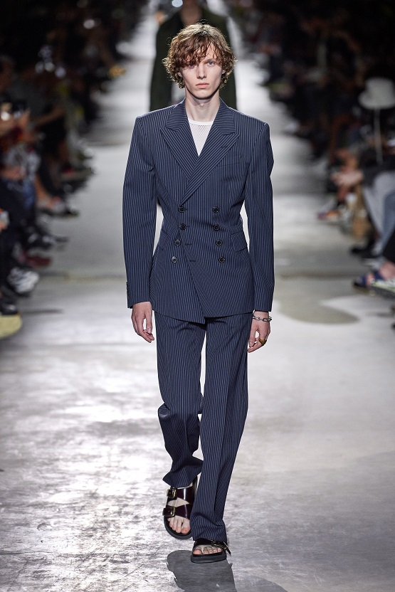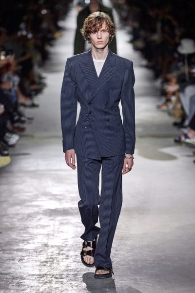 Μια πολύ ενδιαφέρουσα έκδοση ενός κλασικού ντυσίματος για ψηλούς και αδύνατους άνδρες παρουσιάστηκε στις τελικές επιδείξεις μόδας από τη μάρκα Dries Van Noten. Η βάση αυτής της εμφάνισης είναι ένα κομψό μπλε και γκρι κοστούμι δύο τεμαχίων, που αποτελείται από ένα εφαρμοστό σακάκι με διπλό στήθος και ένα μακρύ ίσιο παντελόνι. Η λεπτή κάθετη ρίγα που κοσμεί αυτό το κοστούμι είναι το πιο μοντέρνο κομμάτι φέτος. Ένα ελαφρύ μπλουζάκι με σέσουλα με σέσουλα και χοντρά δερμάτινα σανδάλια από κεράσι, διακοσμημένα με υπερμεγέθη χρυσές αγκράφες μαλακώνουν τη σοβαρότητα αυτής της απλής αλλά τολμηρής εμφάνισης.