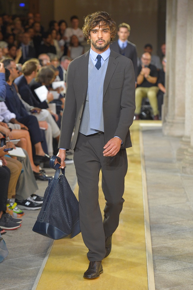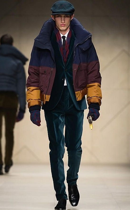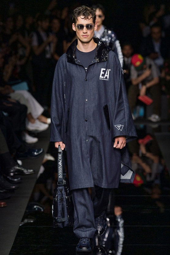 Ένα εξαιρετικό παράδειγμα μιας υπερσύγχρονης αστικής εικόνας είναι σύνολο που πρότεινε ο Emporio Armani. Μια εντυπωσιακή λεπτομέρεια αυτού του συνόλου είναι ένα κομψό μελάνι-μπλε αδιάβροχο ακριβώς κάτω από το μήκος του γόνατος. Αυτή η εμφάνιση συμπληρώνεται οργανικά με κλασικά ίσια παντελόνια και μπλουζάκι, που ταιριάζουν με το αδιάβροχο. Το προτεινόμενο σύνολο δικαιωματικά μπορεί να θεωρηθεί ως μια ιδανική έκδοση μιας κομψής ανδρικής στολής σε περίπτωση κακοκαιρίας, η οποία είναι χαρακτηριστική για την εκτός εποχής στις περισσότερες περιοχές της Ρωσίας.