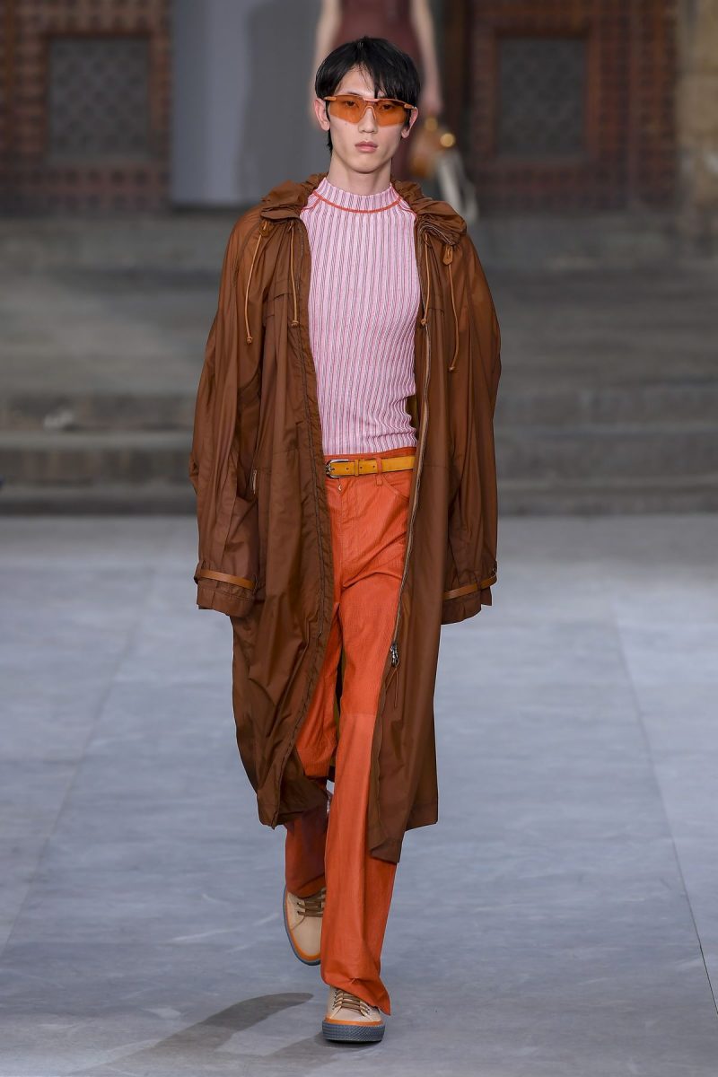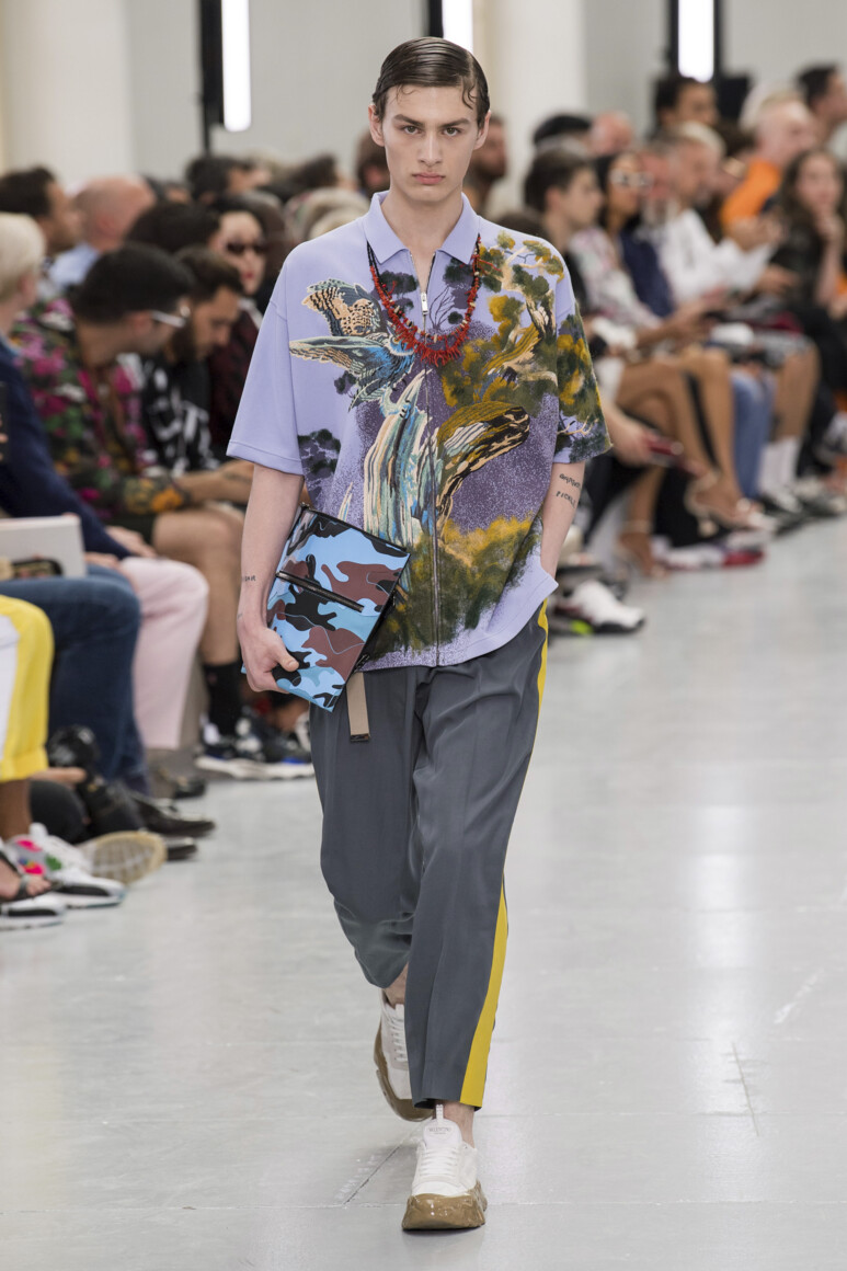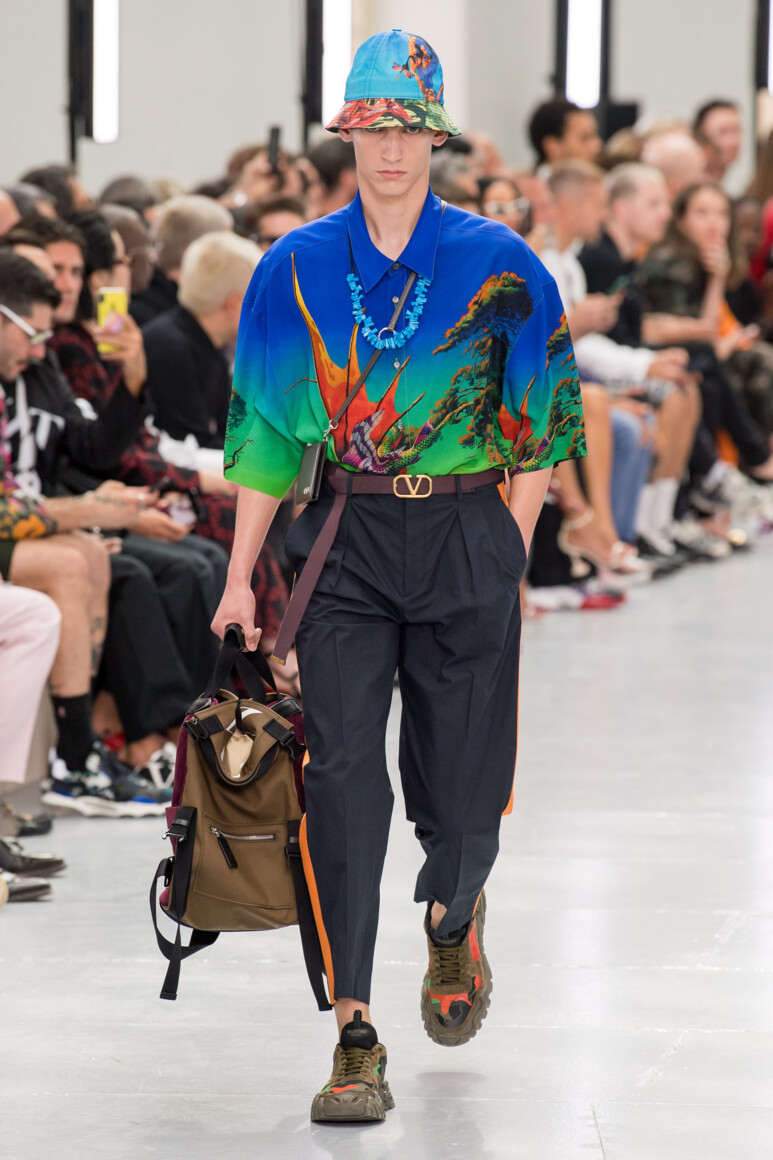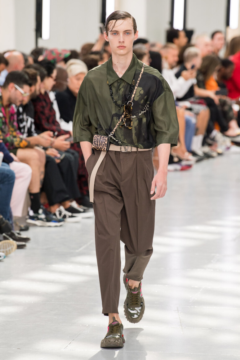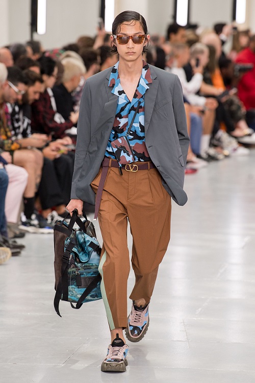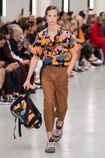 Ένα παράδειγμα μιας πολύ φωτεινής και πιασάρικης casual εμφάνισης μπορεί να θεωρηθεί το σύνολο που παρουσίασε φέτος η μάρκα Valentino. Η κύρια λεπτομέρεια αυτής της εμφάνισης είναι το πρωτότυπο πουκάμισο με ένα φανταχτερό μοτίβο που μιμείται πολύχρωμο καμουφλάζ. Το ίδιο μοτίβο υπάρχει στη διακόσμηση του σακιδίου, που συμπληρώνει την εικόνα. Το κλασικό, ελαφρώς κωνικό παντελόνι από τερακότα που ανοίγει τους αστραγάλους και τα τεράστια πάνινα παπούτσια με ανάγλυφη σόλα ταιριάζουν οργανικά στο παρουσιαζόμενο σύνολο.