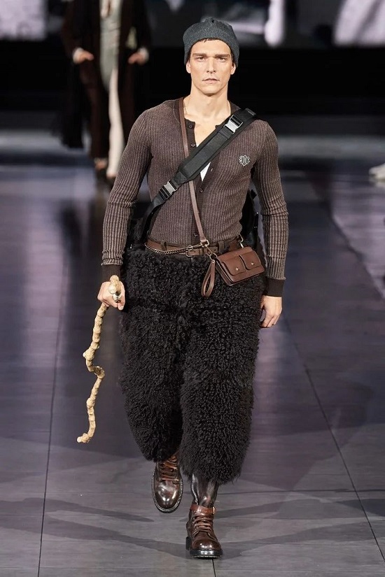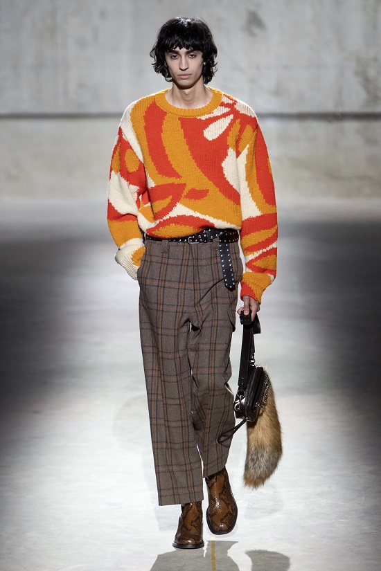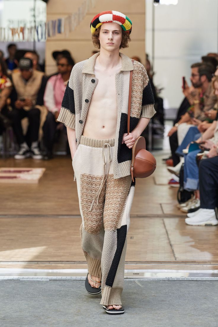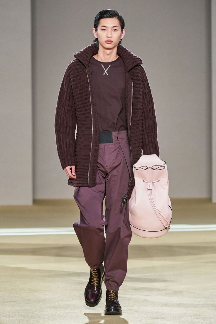 Διάσημη μάρκα του Λονδίνου JW Anderson παρουσίασε στο κοινό το πρωτότυπο ένα σύνολο που αποτελείται από μια ευρύχωρη ζακέτα και πλεκτό φαρδύ παντελόνι με χαμηλή άνοδο.