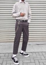 Η ιδέα εδώ είναι οι κάλτσες να συνδυάζονται καλά με το υπόλοιπο look. Τα παπούτσια ή τα πάνινα παπούτσια πρέπει να είναι υπόλευκα (για παράδειγμα, συνδυάστε διαφορετικές αποχρώσεις), και το παντελόνι έχει σκιά σε αντίθεση... Μπορείτε να προσθέσετε ένα φωτεινό πουλόβερ σε αυτή την εμφάνιση και ένα παλτό από εξωτερικά ρούχα.