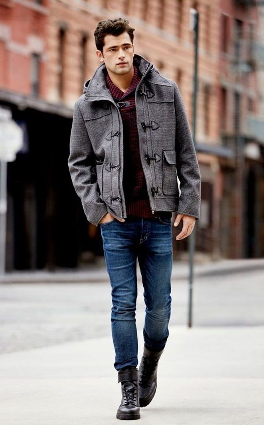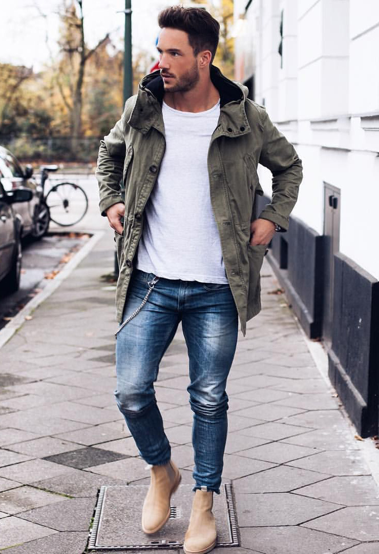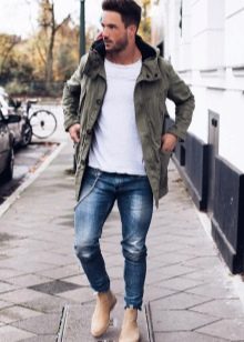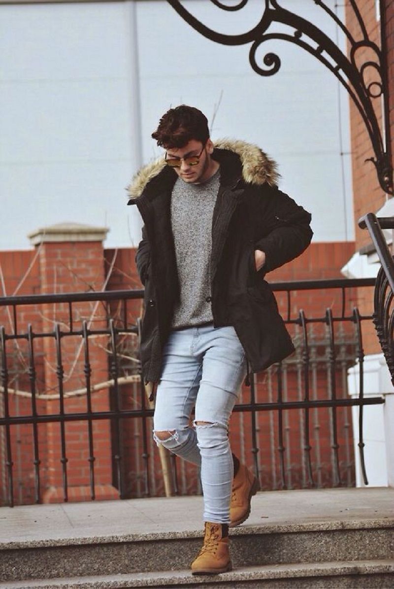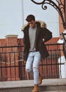 Σε κρύο καιρό, οι άνδρες φορούν ζεστά τζιν και τα παπούτσια πρέπει να είναι τα ίδια. Μπορεί να είναι κλασικές γούνινες μπότες με ψηλές κνήμες ή αθλητικά παπούτσια σε σπορ στυλ.