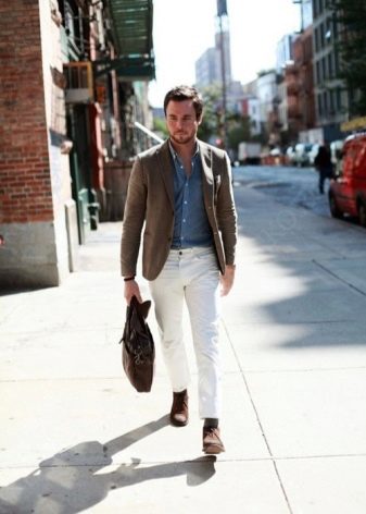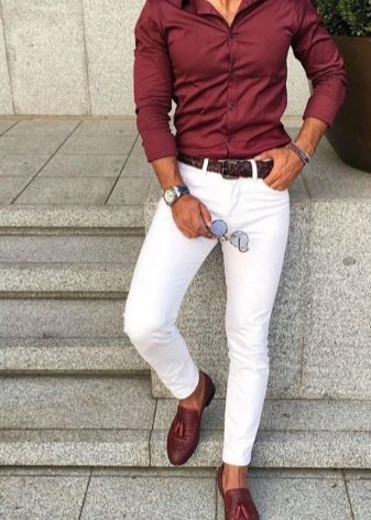 Το καφέ χρώμα είναι δημοφιλές. Πολλοί άνδρες επιλέγουν ακριβώς τέτοια παπούτσια, θεωρώντας τα καθολικά. Ταιριάζει με λευκά τζιν. Τα καφέ μπρούγκες και τα loafers φαίνονται υπέροχα σε ένα τραγανό λευκό φόντο.