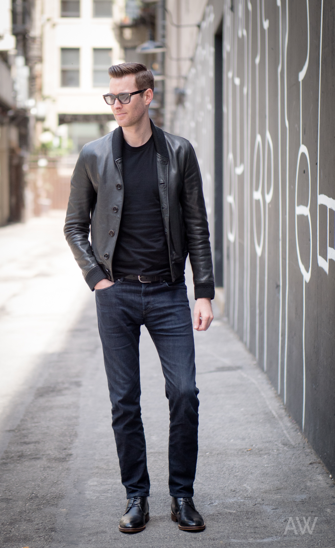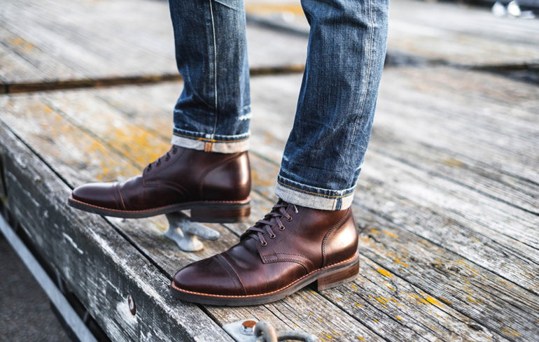 Οι μπότες ντέρμπι ταιριάζουν με μαύρο τζιν και πουκάμισο της Οξφόρδης.