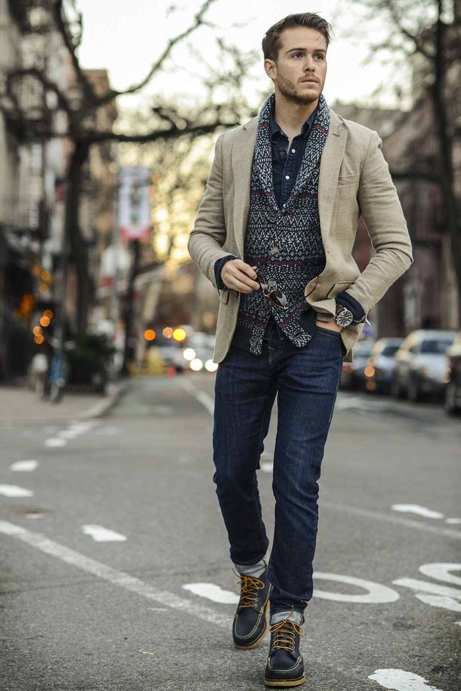 Για να δημιουργήσετε το τέλειο τόξο, είναι απαραίτητο να επιλέξετε έναν αρμονικό συνδυασμό μεταξύ λακωνικών στοιχείων ντουλάπας και "λιγότερο αυστηρού"... Τα τζιν σε συνδυασμό με μπλουζάκι και μπλέιζερ είναι ένα εξαιρετικό παράδειγμα. Τα τζιν παντελόνια μπορούν επίσης να συνδυαστούν με πουκάμισα και κομψά γιλέκα. Για την τελευταία χορδή, χρησιμοποιήστε μοκασίνια που μοιάζουν με loafers ή μπότες chukka. Τα αθλητικά παπούτσια θα ταιριάζουν επίσης σε ένα τέτοιο τόξο, αλλά φαίνονται πιο casual.
