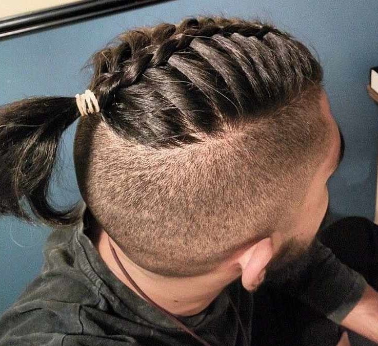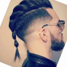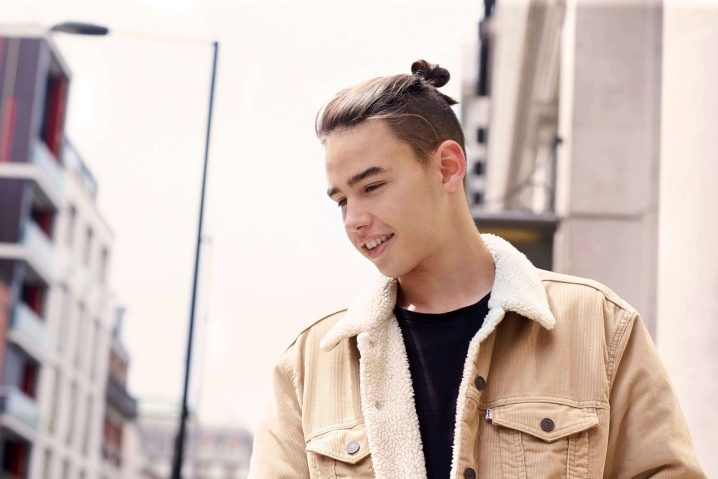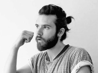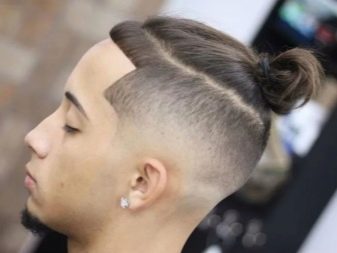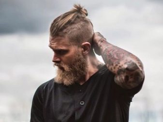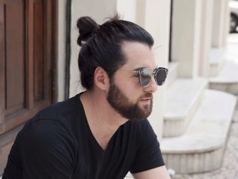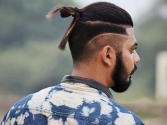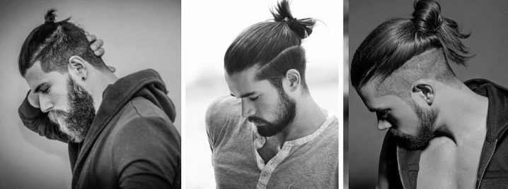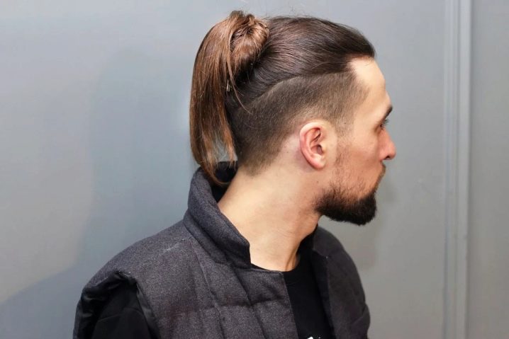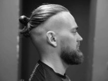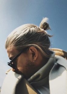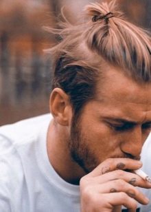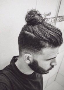 - Κορυφαίος κόμπος σε επιμήκη μαλλιά, συγκεντρωμένος σε κόμπο στο στέμμα. Ένα καλό παράδειγμα ενός μοντέρνου συνδυασμού μακριά αρσενικά μαλλιά και βάναυσο σχεδιασμό του κροταφικού τμήματος του κεφαλιού.