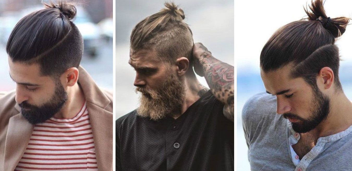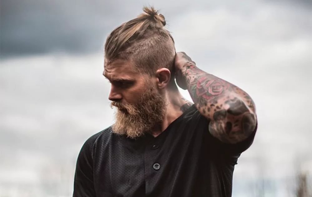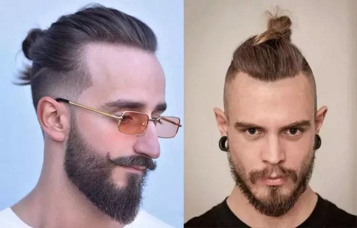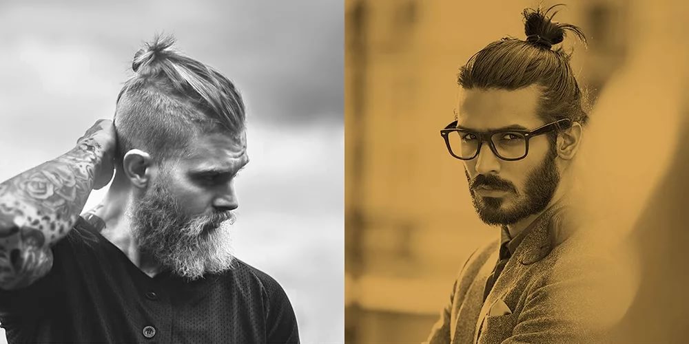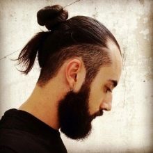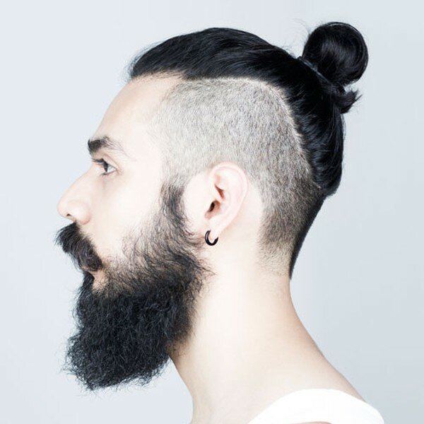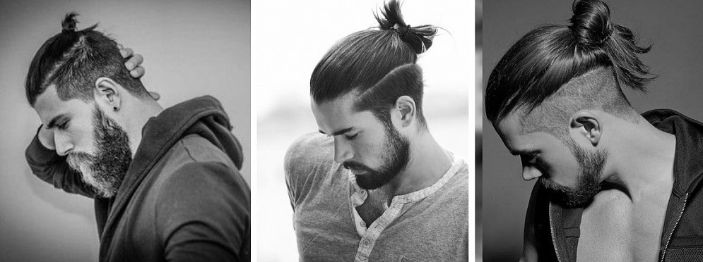 - Top Knot σε αρκετά μακριά μαλλιά. Το χτένισμα είναι μαζεμένο σε κουλούρι, τα υπόλοιπα μαλλιά ξυρίζονται στο ίδιο μήκος, η σιλουέτα ταιριάζει καλά με ένα τακτοποιημένο μούσι και μουστάκι.